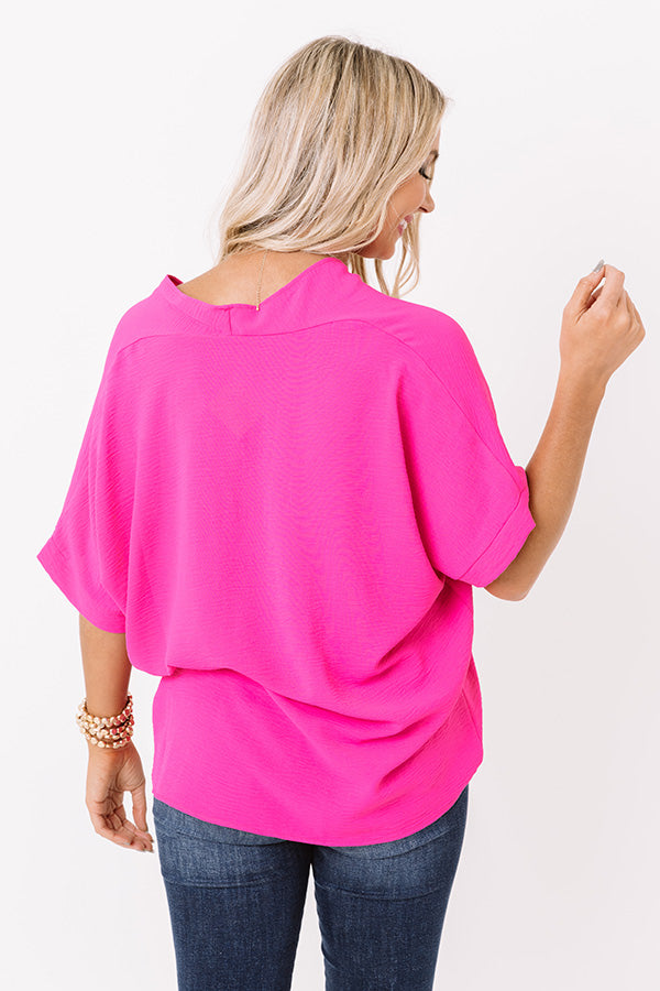 Whether you are looking for a piece to layer or wear solo, our versatile hot pink "Versailles Celebration Shift Top" is perfect for it all with its lightweight flowy material, v-cut neckline, short loose sleeves, and ultra draped silhouette that cascades into a straight hemline! Measurements