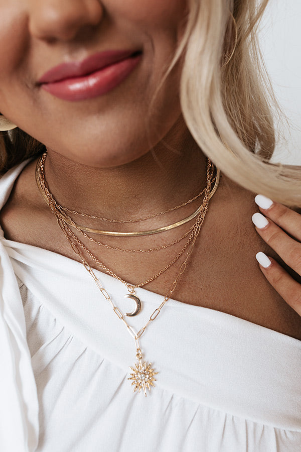 Step up your accessory game with our gorgeous gold 'Vespas And Vino' necklace featuring five layered pieces: a snake chain, two dainty chains, a crescent moon charm chain, and a link chain with a sum pendant!