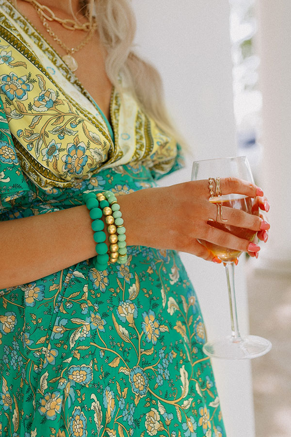 You are sure to pass the vibe check when you accessorize with this pretty bracelet set featuring three turquoise and gold beaded stretch strands!
