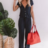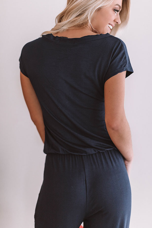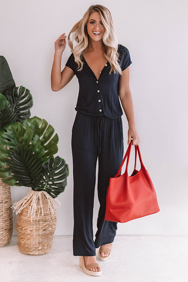 Rainy Saturday vibes in this ultra soft jumpsuit! T-shirt jersey material buttons down the front to the cinched waist that ties for fit before flowing to long, comfortable pants. You don't know true comfort until you've worn this babe!