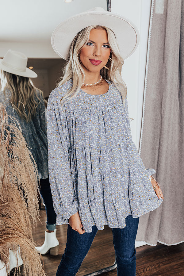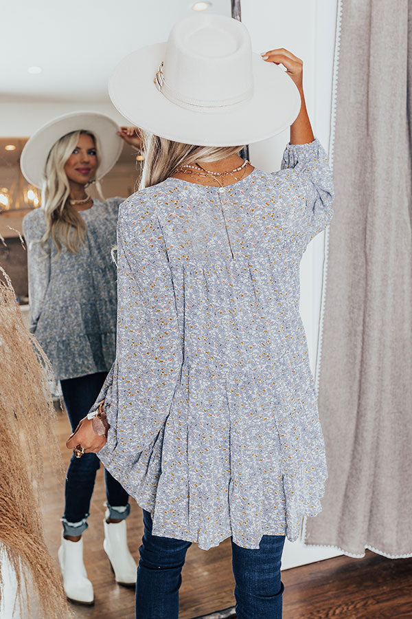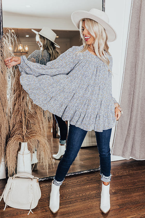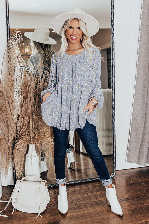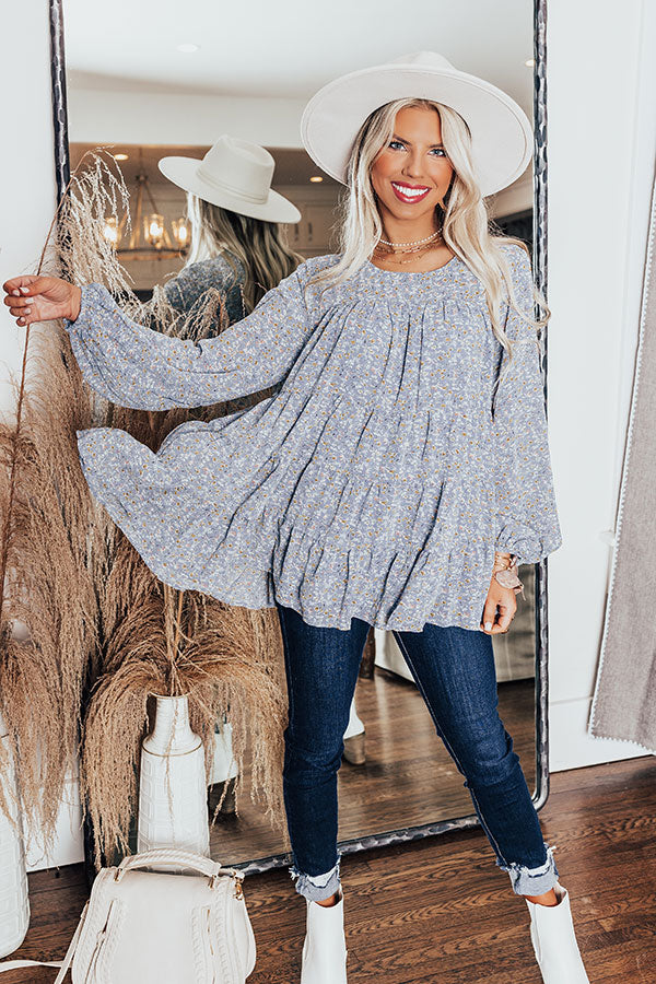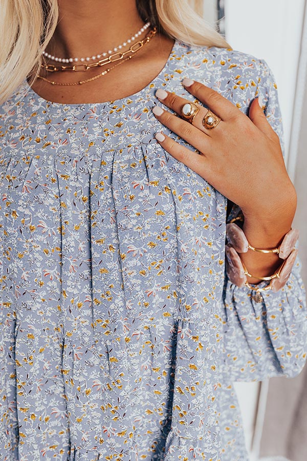 You are sure to turn heads when you arrive in this darling airy blue top featuring lightweight material patterned with a rust and yellow hued floral print, a rounded neckline, long loose sleeves, a keyhole accented upper back with a button closure, and a relaxed silhouette that falls into an uneven hemline! Measurements