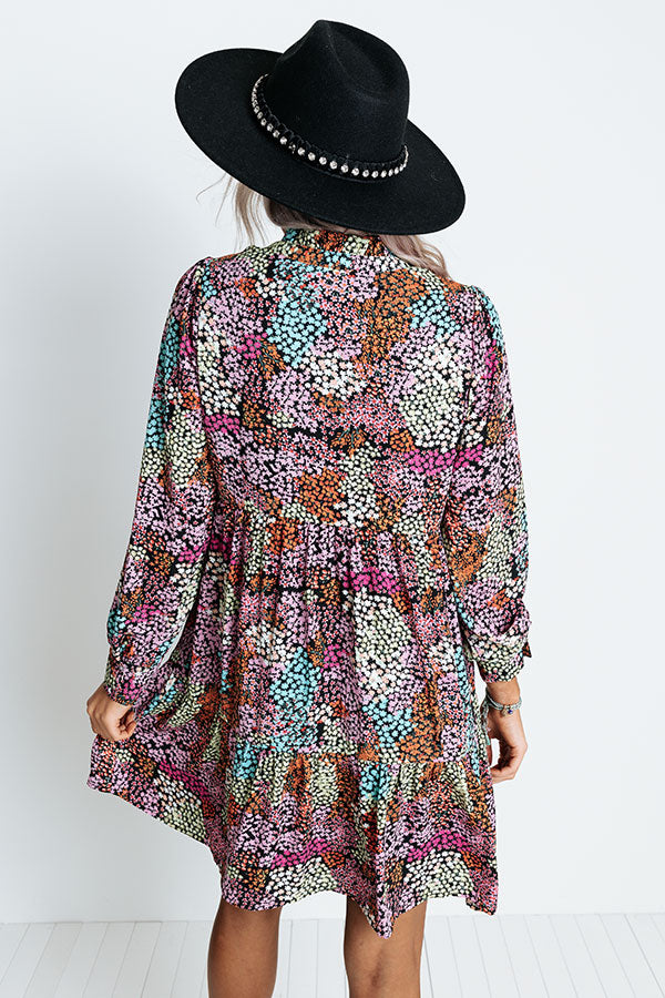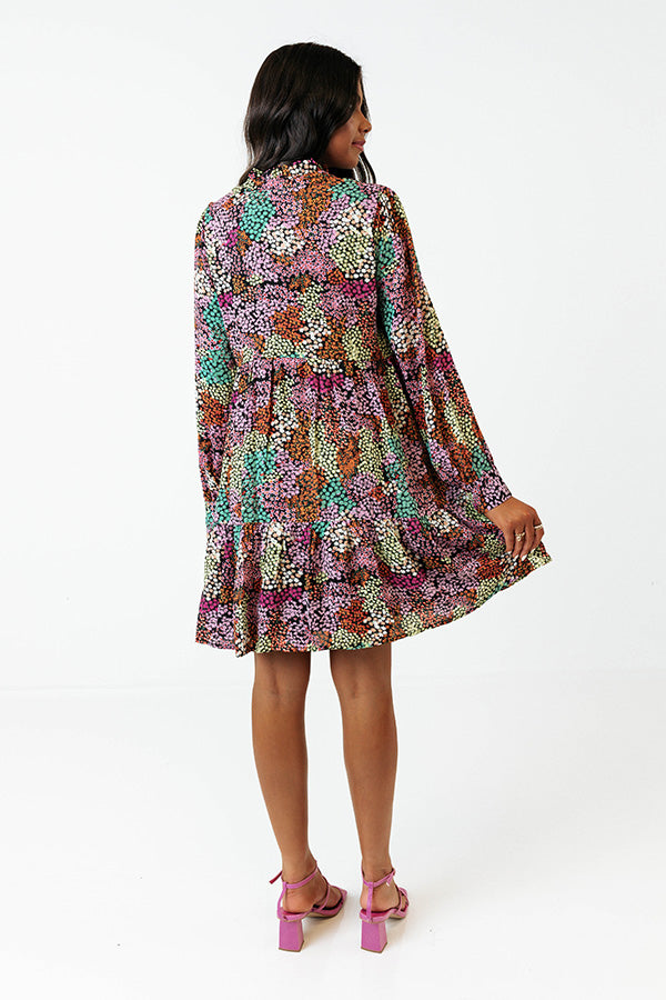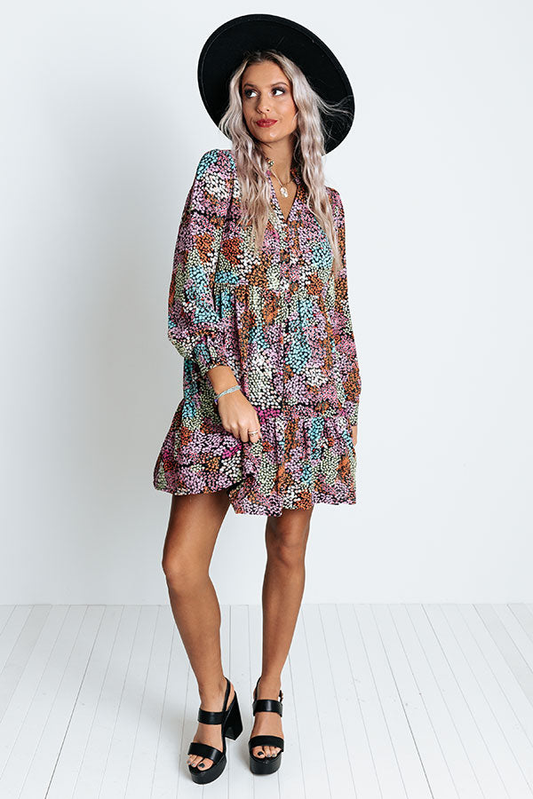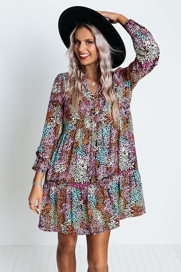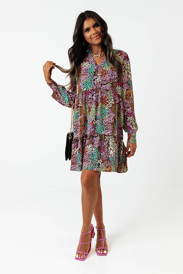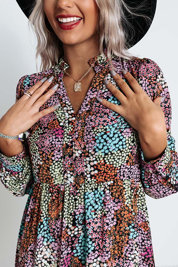 Live life colorfully in this vibrant shift dress featuring lightweight flowy material patterned with a small pink, orange, green, and blue floral print, a v-cut neckline, long loose sleeves with button closure cuffs, and a relaxed silhouette that falls into a straight mid-thigh length peplum hemline!