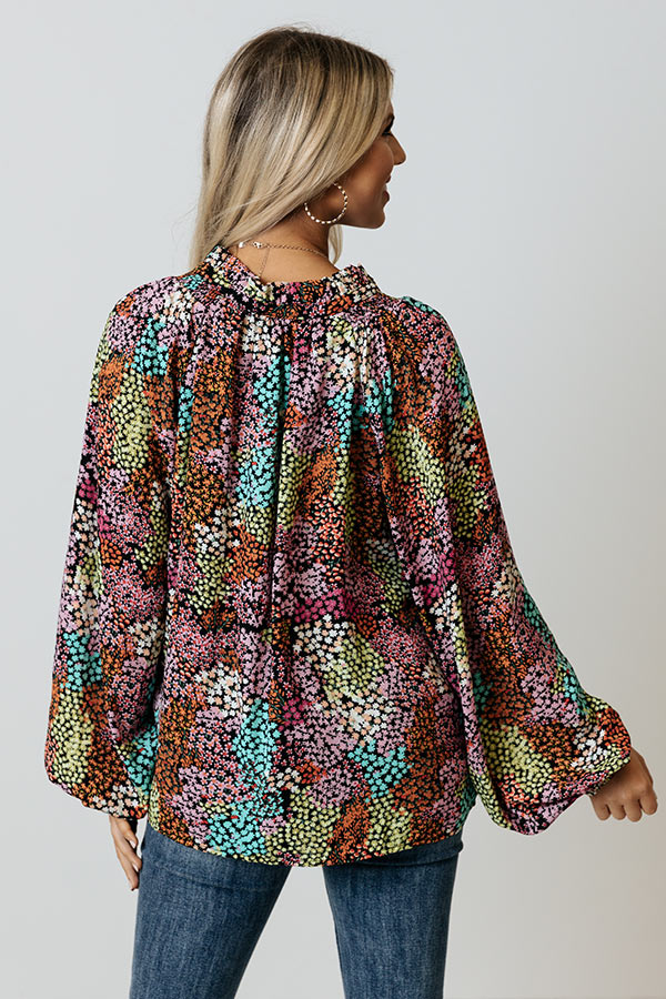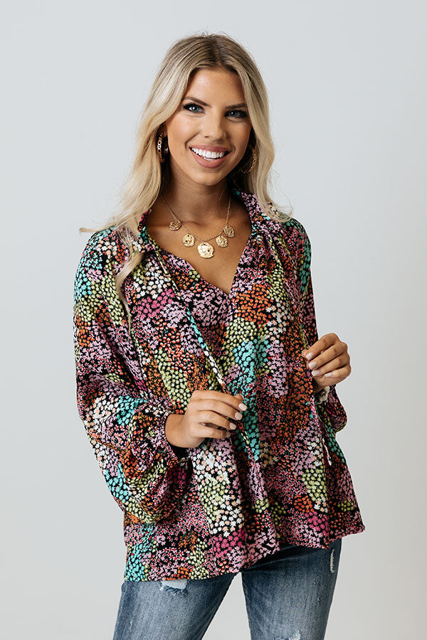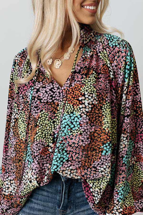 Live life colorfully in this vibrant shift top featuring lightweight flowy material patterned with a small pink, orange, green, and blue floral print, a v-cut neckline with a tie closure, long loose oversized bubble sleeves, and a relaxed silhouette that falls into a straight hemline!