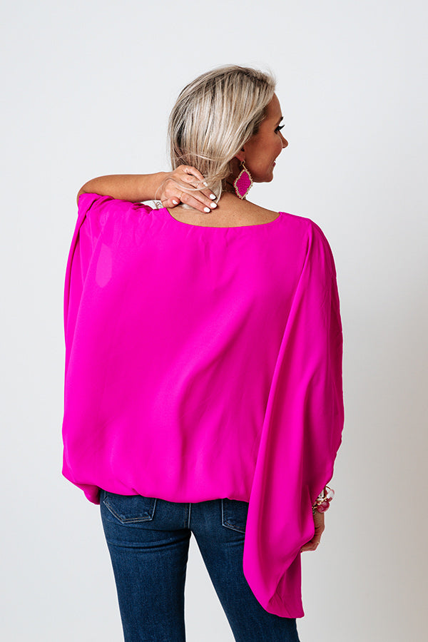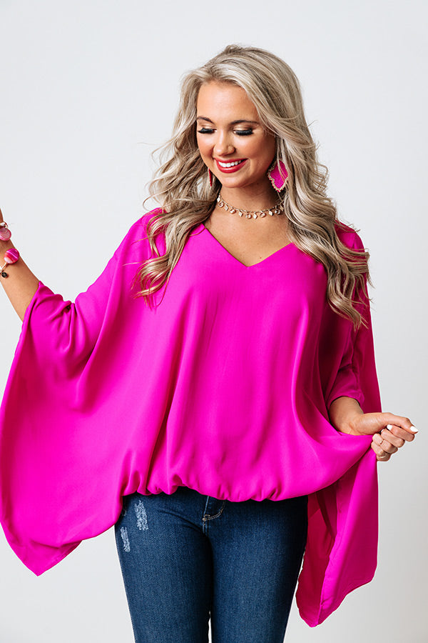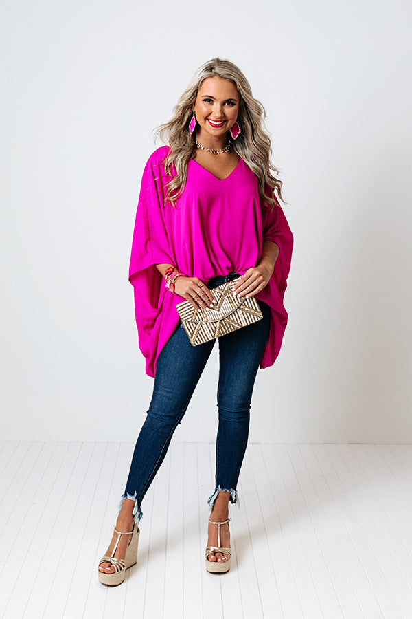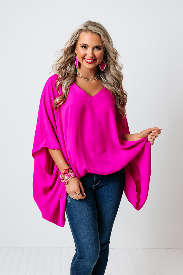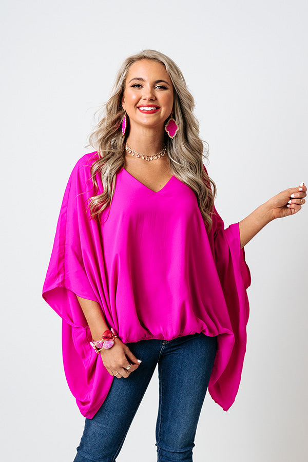 Keep your look simple but significant with our adorable fuchsia hued 'Viennna Smiles Shift Top' featuring lightweight flowy material, a v-cut neckline, oversized bat wing half sleeves, and an ultra draped silhouette that ends in a cinched hemline! Measurements