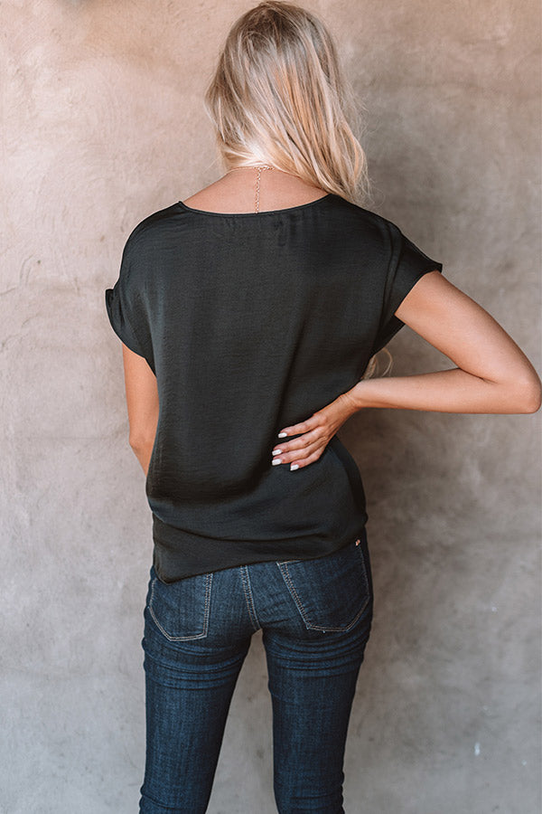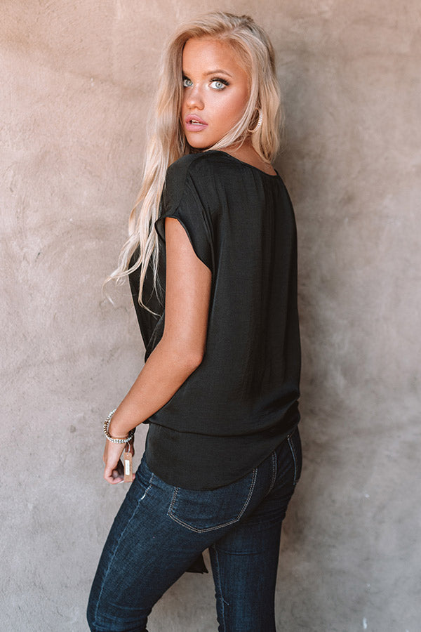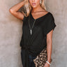 When you have switched into vacay mode, there is no better top to put on than this black cutie featuring a v-neck, short sleeves, a loose fit, and knotted hem! We have styled this elegant piece with some dark cuffed jeans, dainty gold jewelry, and a leopard heel and clutch, but you can also pair it with our "Wild Card High Waist Leopard Shorts," a tan straw hat and tote, and "The Mason Wedge in Black," for the perfect "villa vacation" OOTD! Measurements