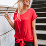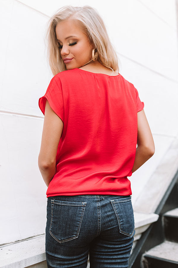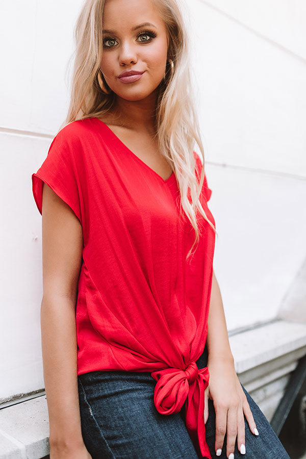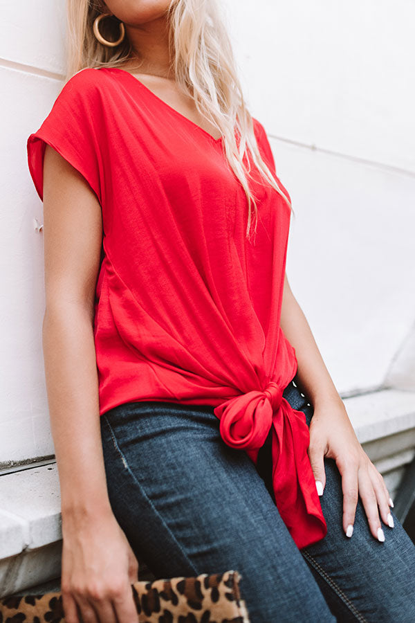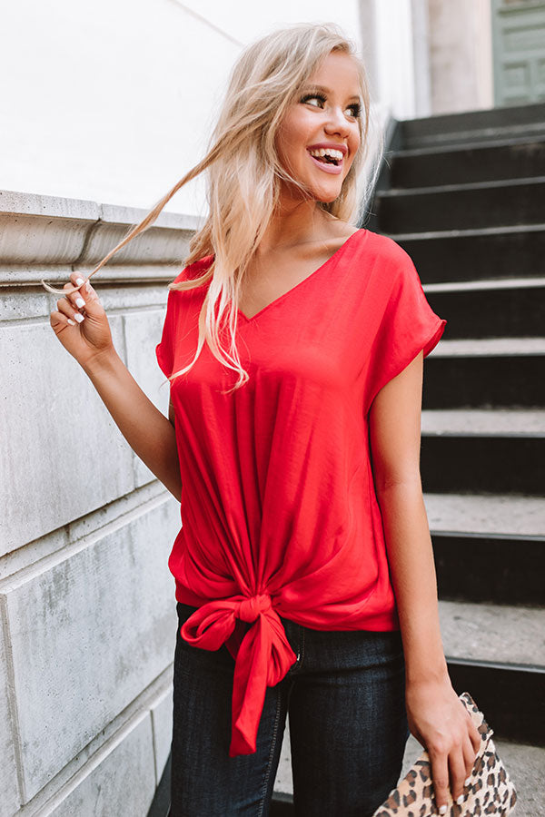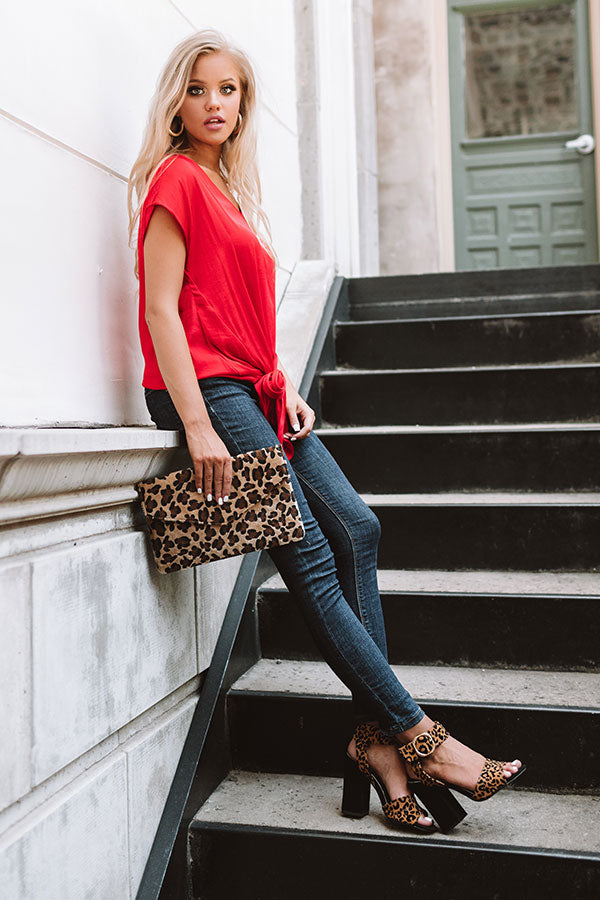 When you have switched into vacay mode, there is no better top to put on than this red cutie featuring a v-neck, short sleeves, a loose fit, and knotted hem! We have styled this elegant piece with some dark skinny jeans, dainty gold jewelry, and a leopard heel and crossbody, but you can also pair it with our "Parker High Waist Distressed Shorts in White," a tan straw hat and tote, and "The Byrdie Stripe Wedge in Red," for the perfect "villa vacation" OOTD! Measurements