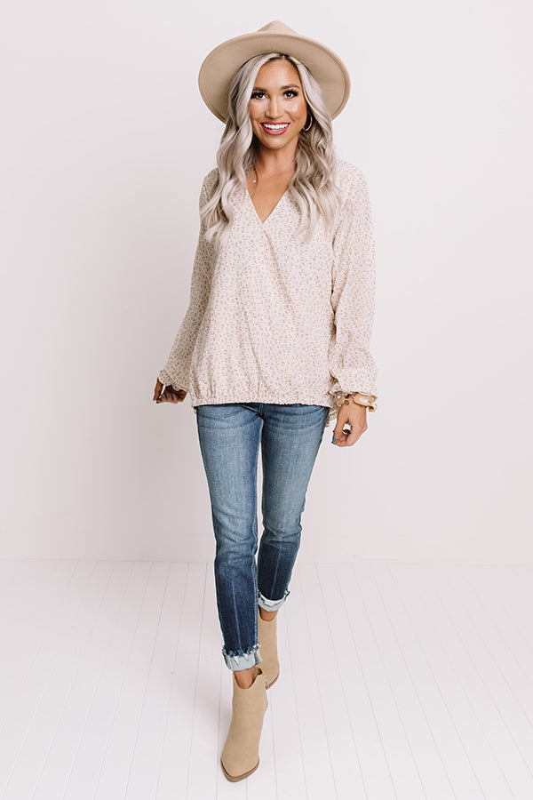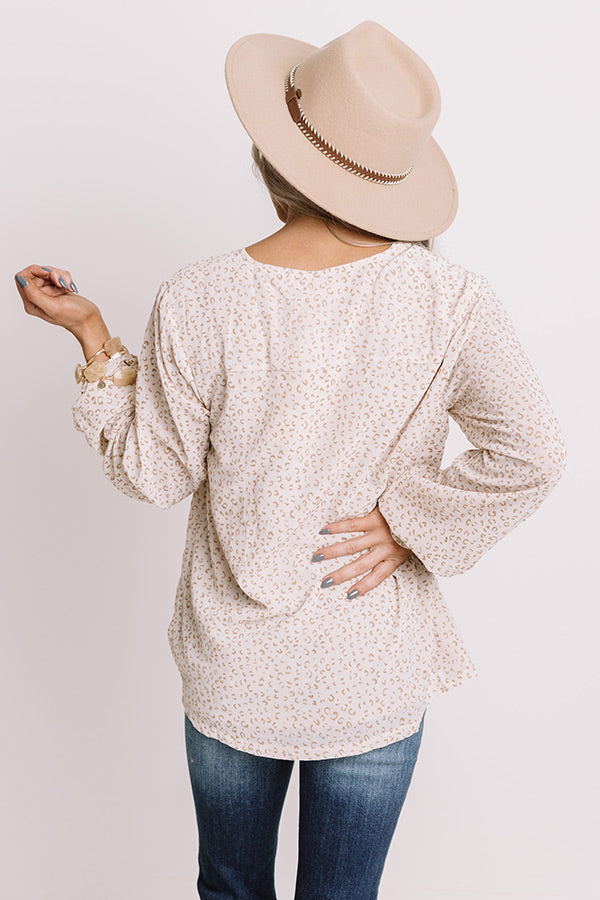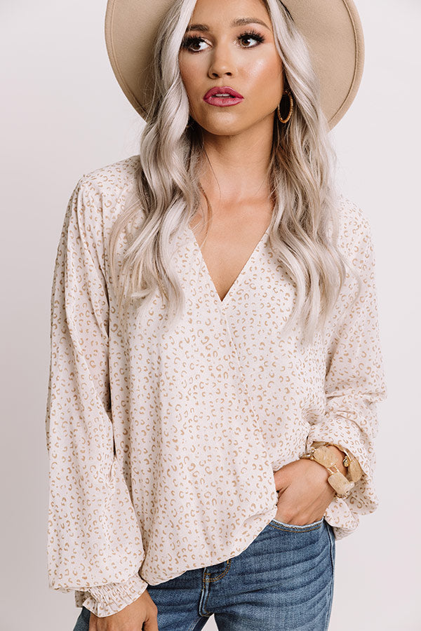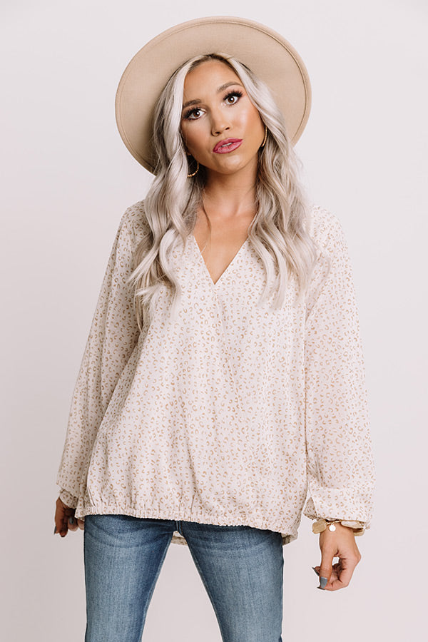 There is no better piece to pack for your "villa vacay" than this adorable birch colored shift top featuring lightweight breezy material patterned with a brown leopard print, a wrapped bodice with a v-cut neckline, long loose bishop sleeves with fitted elastic banded cuffs, and a relaxed silhouette that falls into a rounded hemline! Measurements