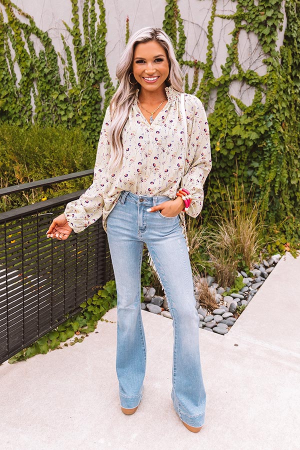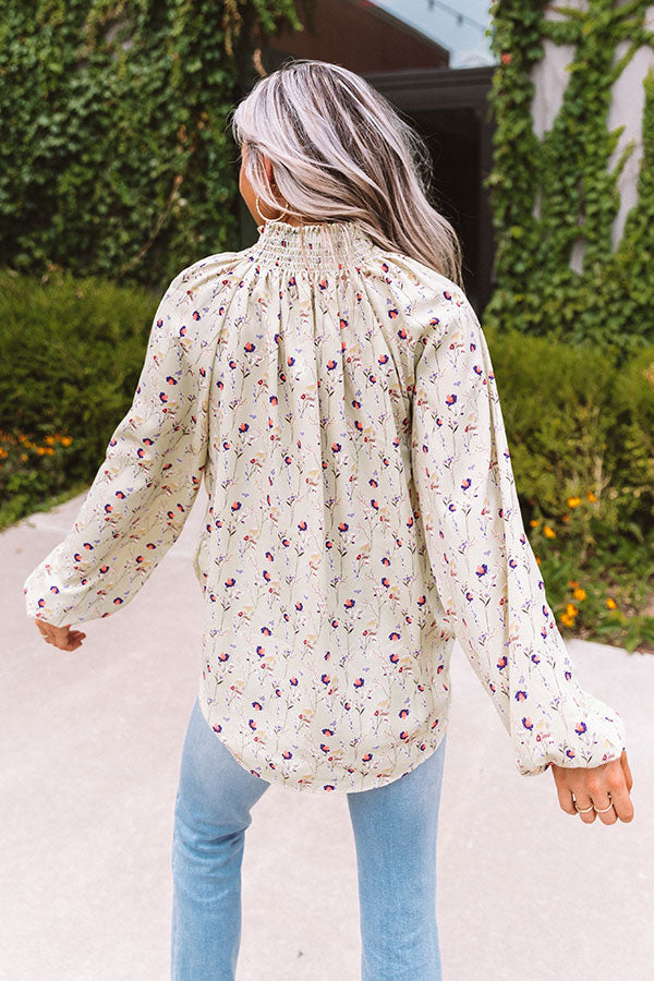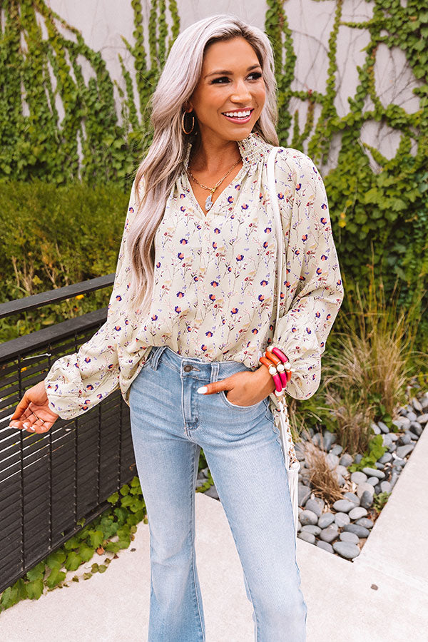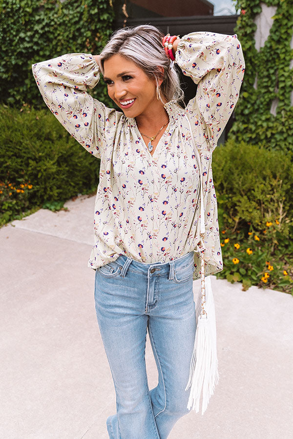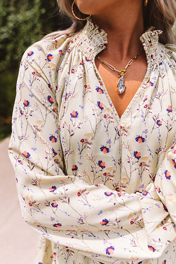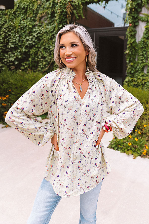 You will look like a true fashionista in our darling seafoam hued 'Vineyard Bound' shift top featuring lightweight and breezy material patterned with a small purple and orange hued floral print, a v-cut neckline with a smocked collar, long bubble sleeves, and a relaxed silhouette that falls into a rounded hemline!