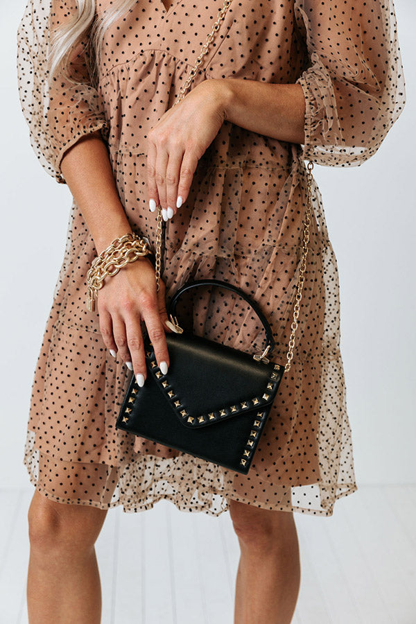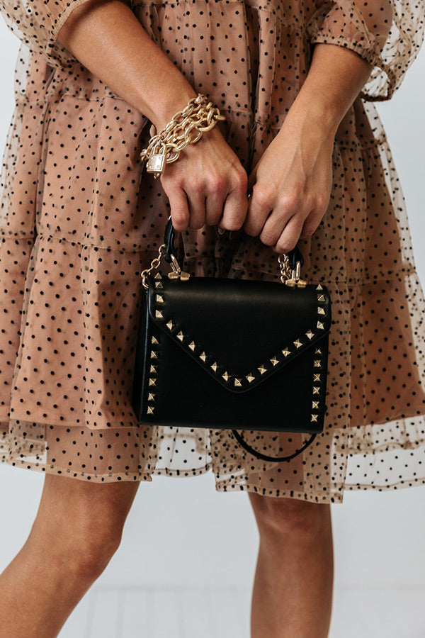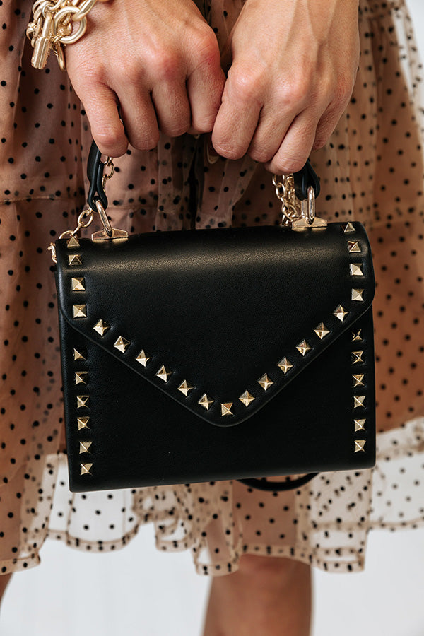 Our chic black 'Vineyard Bound' purse is sure to be envied with its sleek lightweight material, gold studded detailing, removable chain link shoulder strap, single short handle, envelope closure with a snap button, and spacious square silhouette with an additional inside pocket!