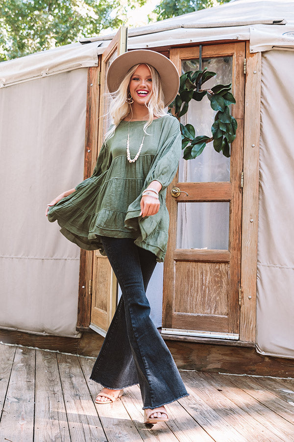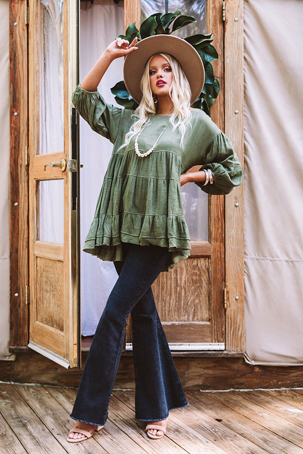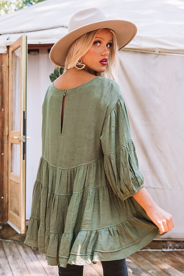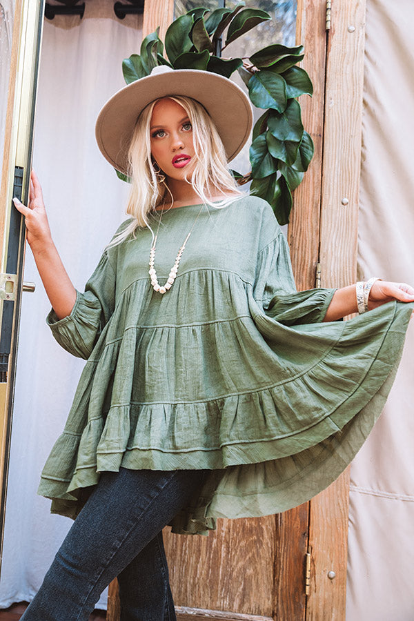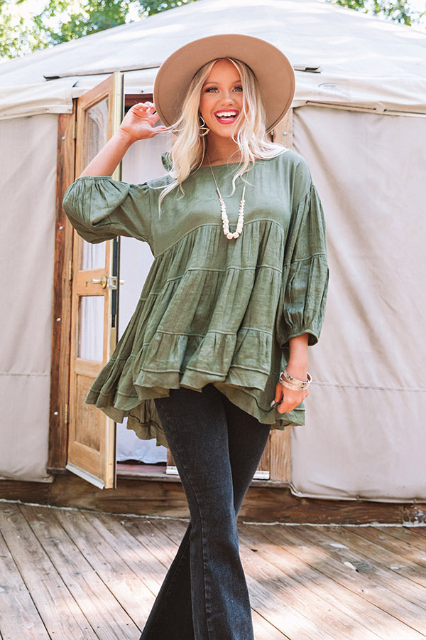 Await the autumn season in style with our adorable green hued "Vineyard Season" top featuring lightweight material, a high rounded neckline, oversized 3/4-length bubble sleeves with elastic cuffs, a keyhole accented upper back with a button closure, and an ultra relaxed babydoll silhouette that falls into an uneven tunic-length hemline! Measurements
