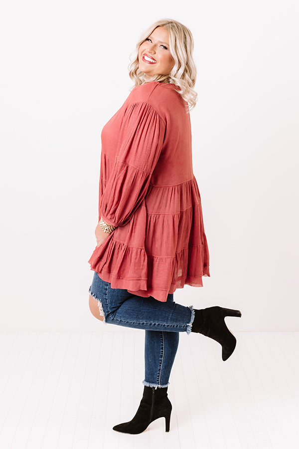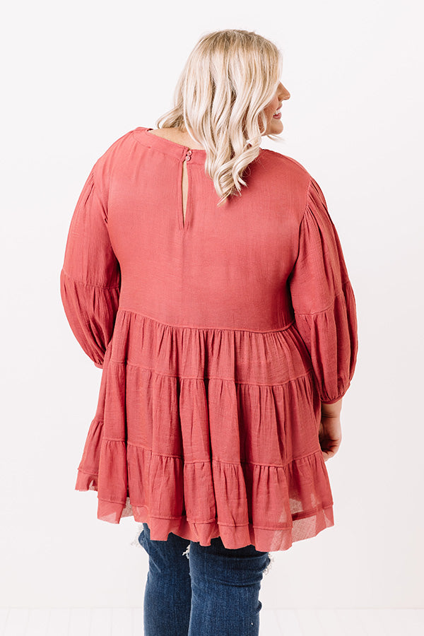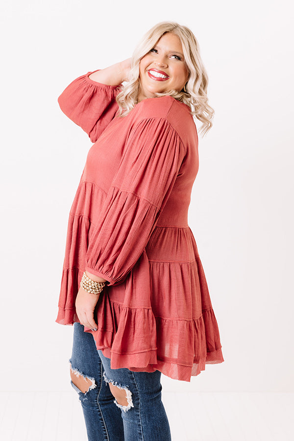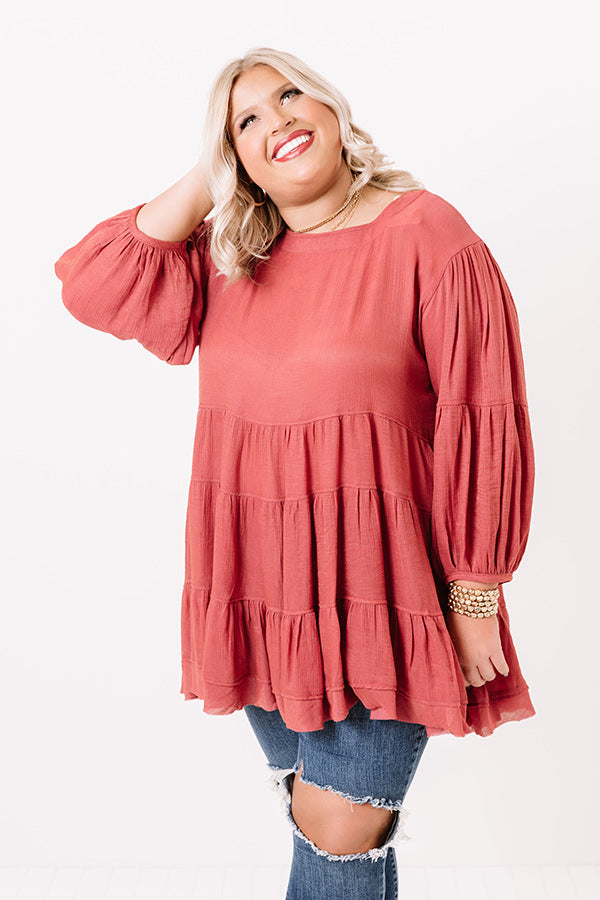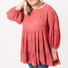 Plus Size - Await the autumn season in style with our adorable rose hued "Vineyard Season" top featuring lightweight material, a high rounded neckline, oversized 3/4-length bubble sleeves with elastic cuffs, a keyhole accented upper back with a button closure, and an ultra relaxed babydoll silhouette that falls into an uneven tunic-length hemline!