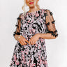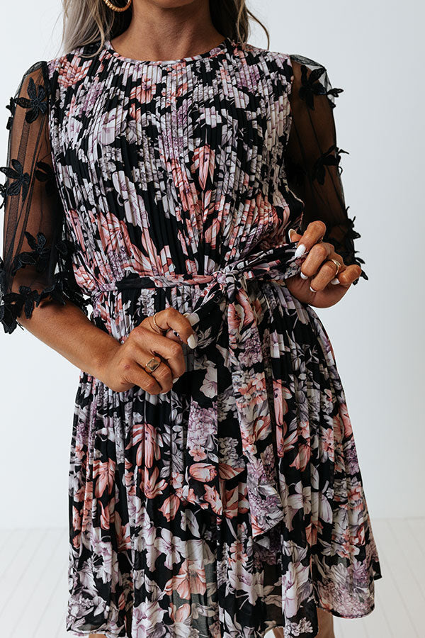 Let your style bloom in our gorgeous black 'Vineyard Villa' dress featuring lightweight pleated material patterned with a beautiful floral print, a rounded neckline, loose semi-sheer 3/4-length sleeves with floral embellishing, a cinched waistline with a tie closure, a keyhole accented upper back with a button closure, and a relaxed skirt silhouette that falls into a straight mid-thigh length hemline!