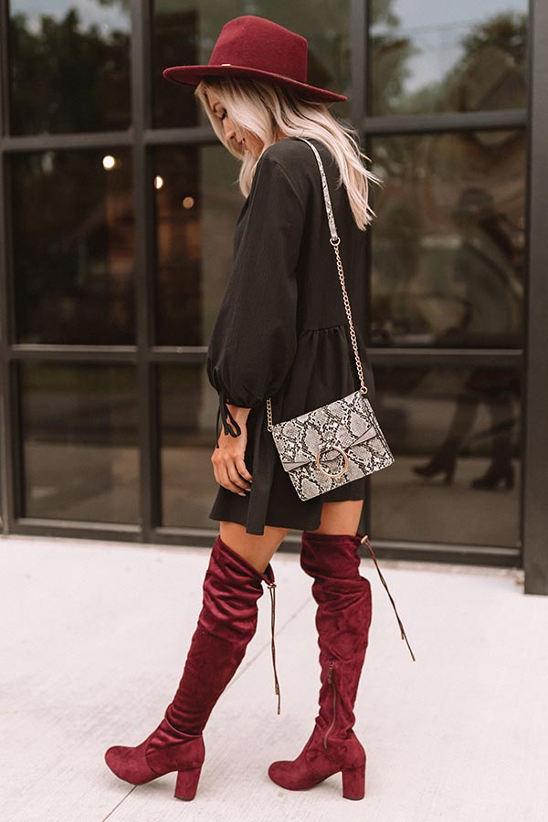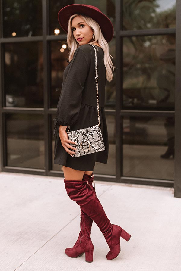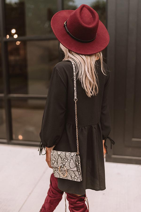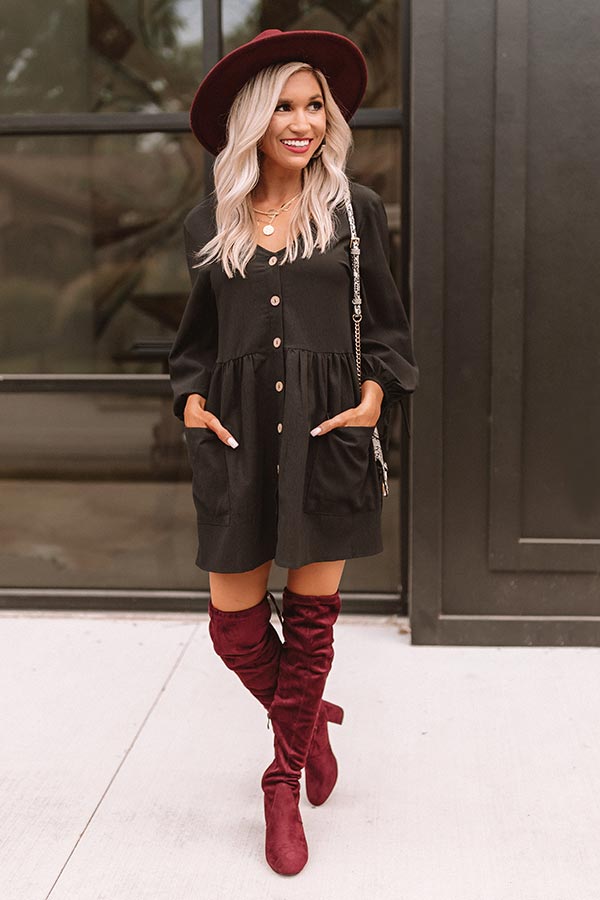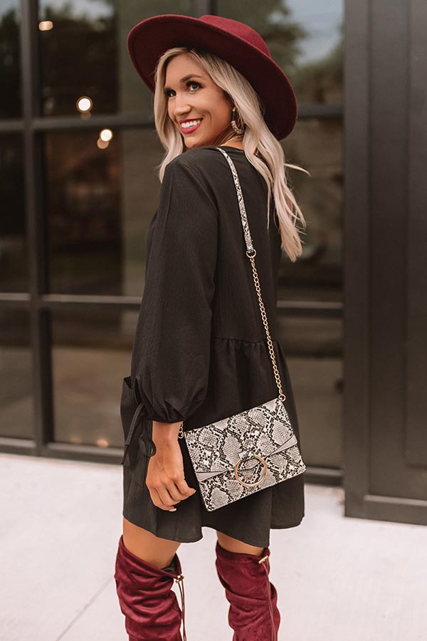 Stay chic on your "vineyard visit" with this black tunic dress featuring lightweight material, long bishop sleeves with tie closure cuffs, a button down bodice with a wide v-cut neckline, front accent pockets, and a breezy skirt that falls into a mid-thigh length straight hemline! We have accessorized this piece with a snake print crossbody and a merlot over the knee boot and faux suede hat, but you can also style it with patterned accents like "The Byrdie Leopard Wedge" and our "Total Knockout Leopard Earrings!" Measurements