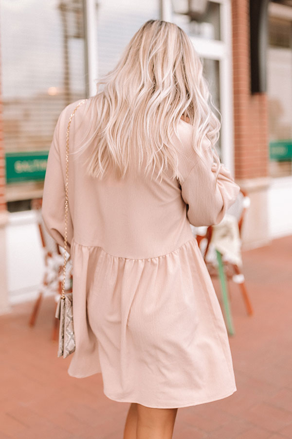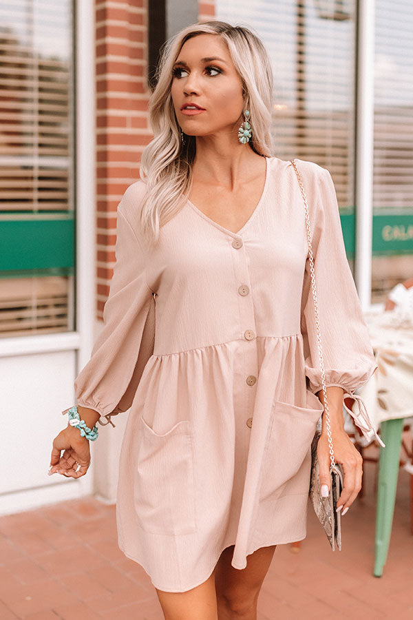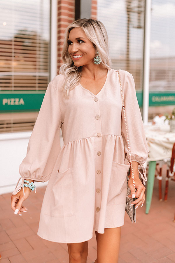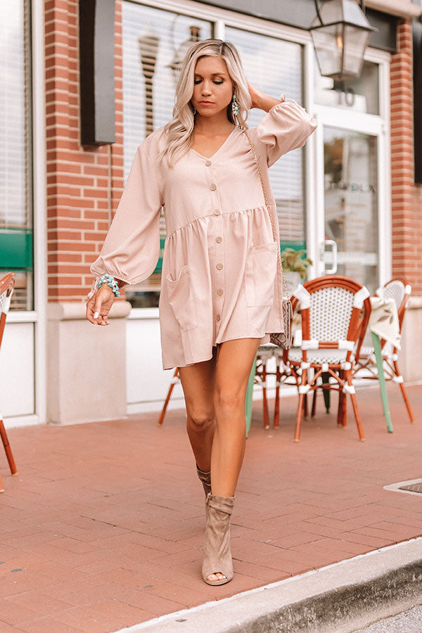Stay chic on your "vineyard visit" with this latte colored tunic dress featuring lightweight material, long bishop sleeves with tie closure cuffs, a button down bodice with a wide v-cut neckline, front accent pockets, and a breezy skirt that falls into a mid-thigh length straight hemline! We have accessorized this piece with neutral peep toe booties and turquoise statement jewelry, but you can also style it with more patterned accents like "The Lyra Snake Print Heel" and our "Truth Or Dare Tote in Latte!" Measurements