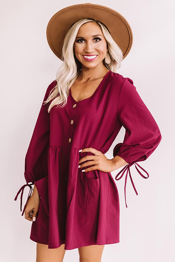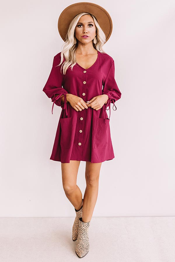 Stay chic on your "vineyard visit" with this wine colored tunic dress featuring lightweight material, long bishop sleeves with tie closure cuffs, a button down bodice with a wide v-cut neckline, front accent pockets, and a breezy skirt that falls into a mid-thigh length straight hemline! We have accessorized this piece with a snake print crossbody and a black over the knee boot and faux suede hat, but you can also style it with patterned accents like "The Byrdie Leopard Wedge" and our "Total Knockout Leopard Earrings!" Measurements