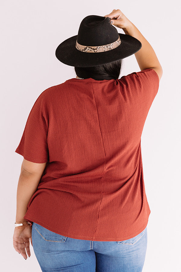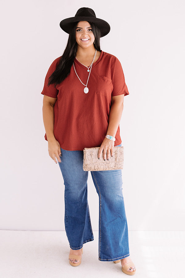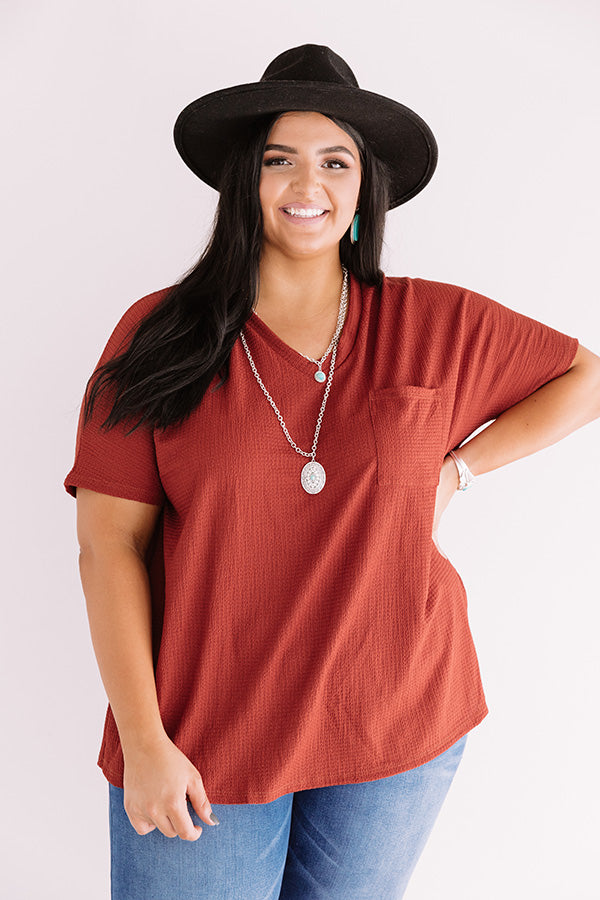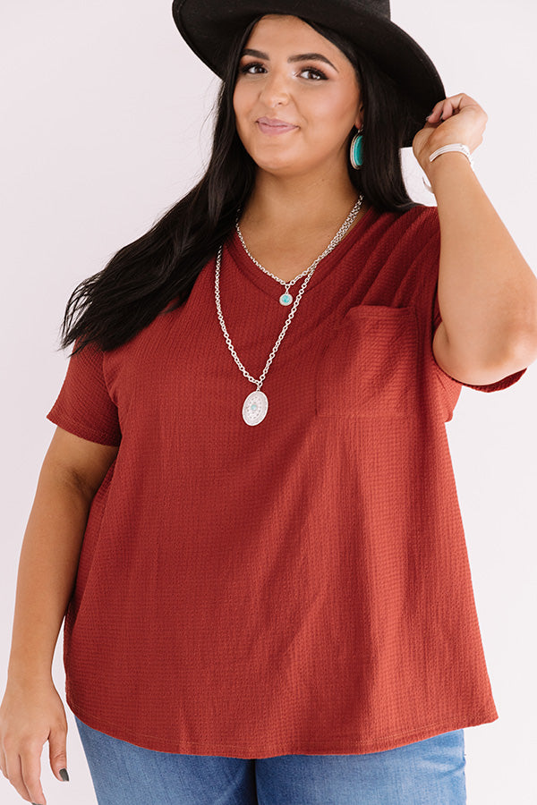 Plus Size - May all your wishes come true in this casual cute dark rust colored shift top featuring soft lightweight material with subtle waffle knit texturing, a v-cut neckline, short loose sleeves, a single accent chest pocket, and a relaxed silhouette that falls into a rounded hemline! Measurements