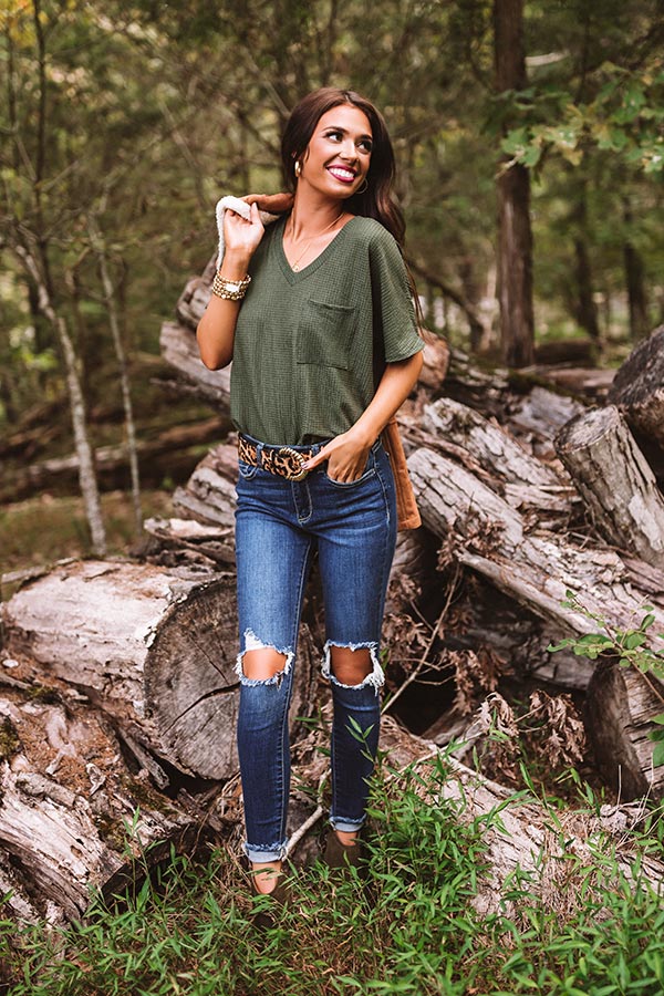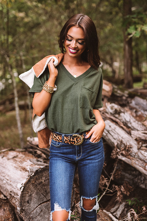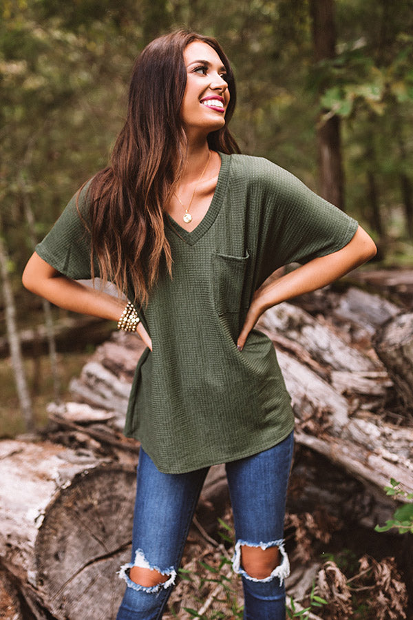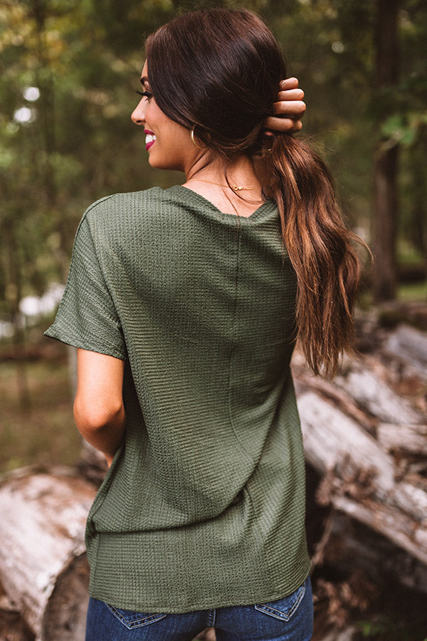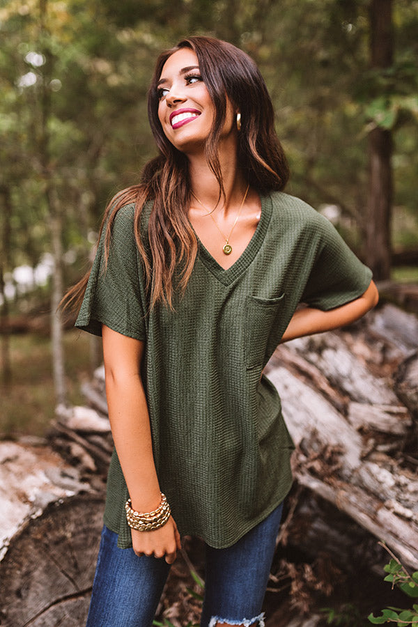 May all your wishes come true in this casual cute olive colored shift top featuring soft lightweight material with subtle waffle knit texturing, a v-cut neckline, short loose sleeves, a single accent chest pocket, and a relaxed silhouette that falls into a rounded hemline! Measurements