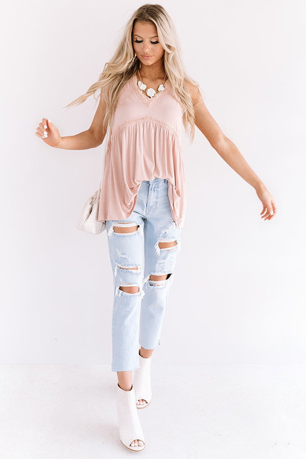 Whether you are enjoying "Vino by the sea" or sipping it on a patio for happy hour, this versatile latte colored top is perfect for any occasion! It features lightweight breezy material with intricate crochet detailing, a v-cut neckline and upper back, wide 2-inch sleeveless shoulder straps, and an ultra relaxed babydoll silhouette that falls into an uneven tunic length hemline! We have styled this piece with some distressed light wash skinnies and white statement necklace, wedged bootie, and bucket bag, but you can also wear it with some black shorts, "The Melina faux Leather Heel in Latte," and our "Sunshine Suite Sunnies in Black!" Measurements