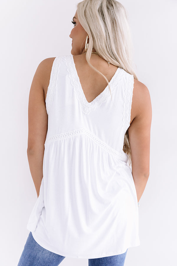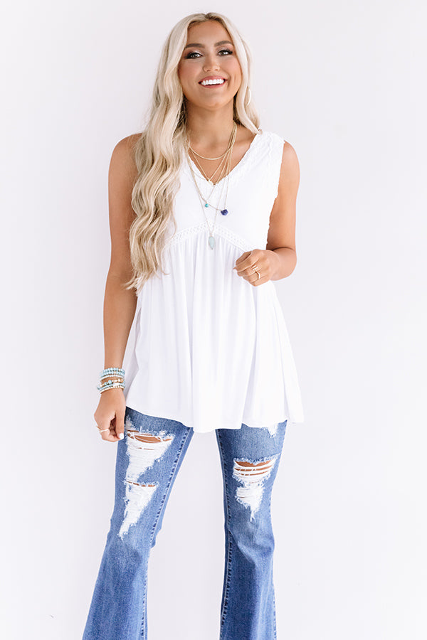 Whether you are enjoying "Vino by the sea" or sipping it on a patio for happy hour, this versatile white top is perfect for any occasion! It features lightweight breezy material with intricate crochet detailing, a v-cut neckline and upper back, wide 2-inch sleeveless shoulder straps, and an ultra relaxed babydoll silhouette that falls into an uneven tunic length hemline! We have styled this piece with some distressed dark wash flares and a brown heel and bucket bag, but you can also wear it with some black shorts, "The Alba Wedge in Rust," and our "Bombay Boardwalk Paisley Hair Scarf in Rust!" Measurements