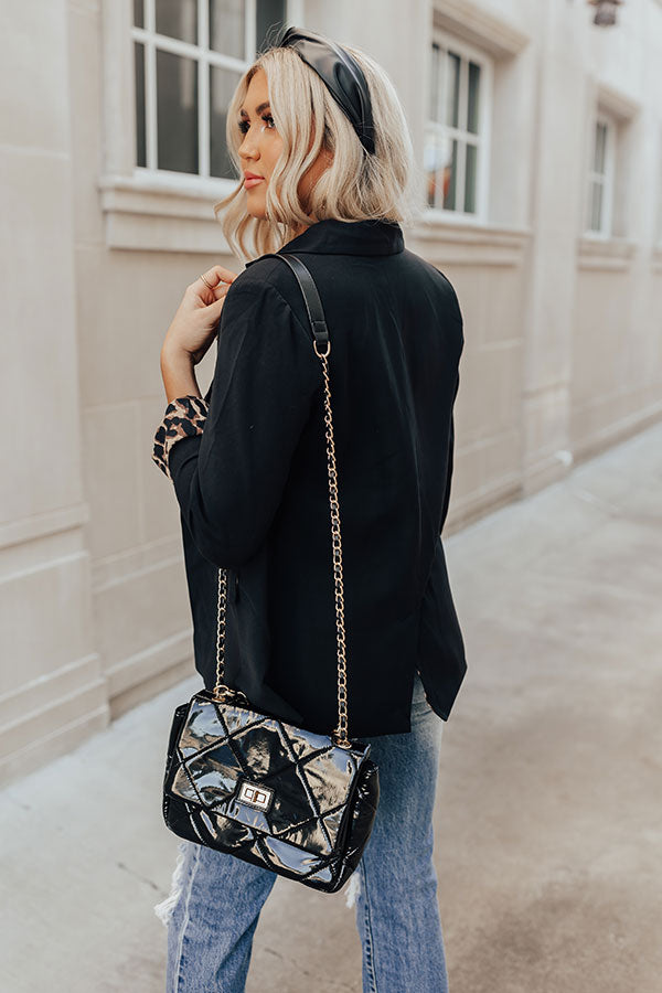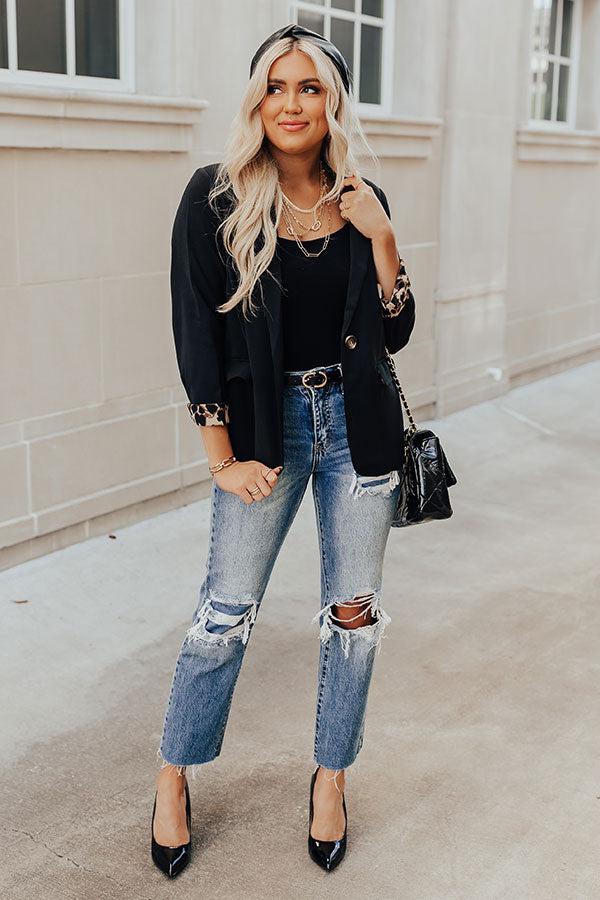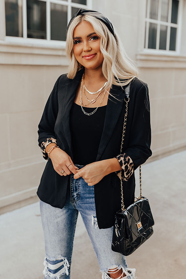 Add a fun pop of print to your office look with our black 'Vino In Hand Blazer' featuring sleek lightweight material with lined with a bold black and brown leopard print, long loose sleeves, two low pocket cuts, a single button front closure, a collared neckline, and a relaxed but sophisticated silhouette that ends in a straight hemline! Measurements