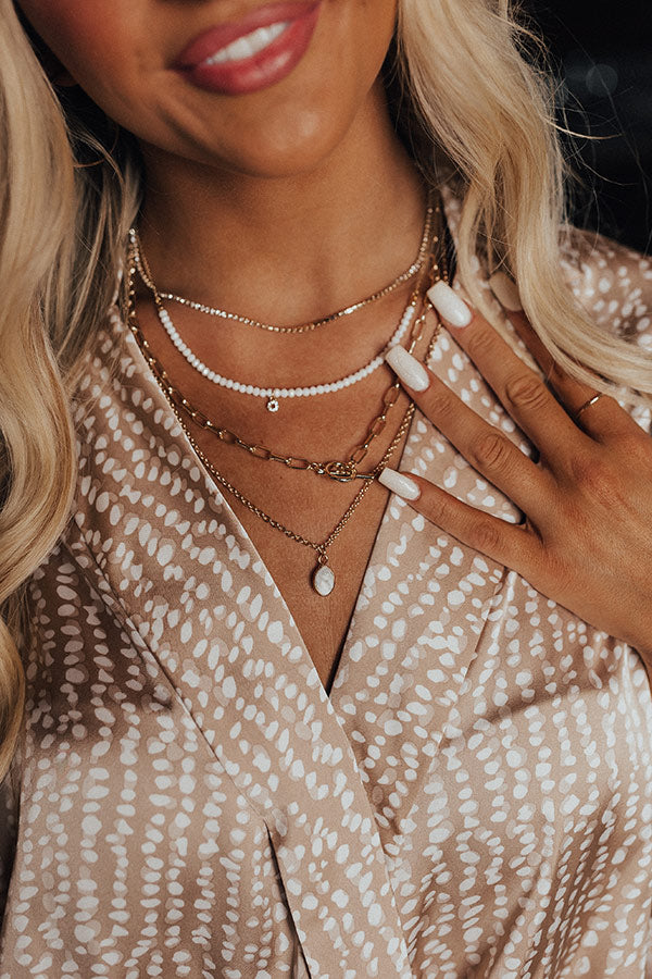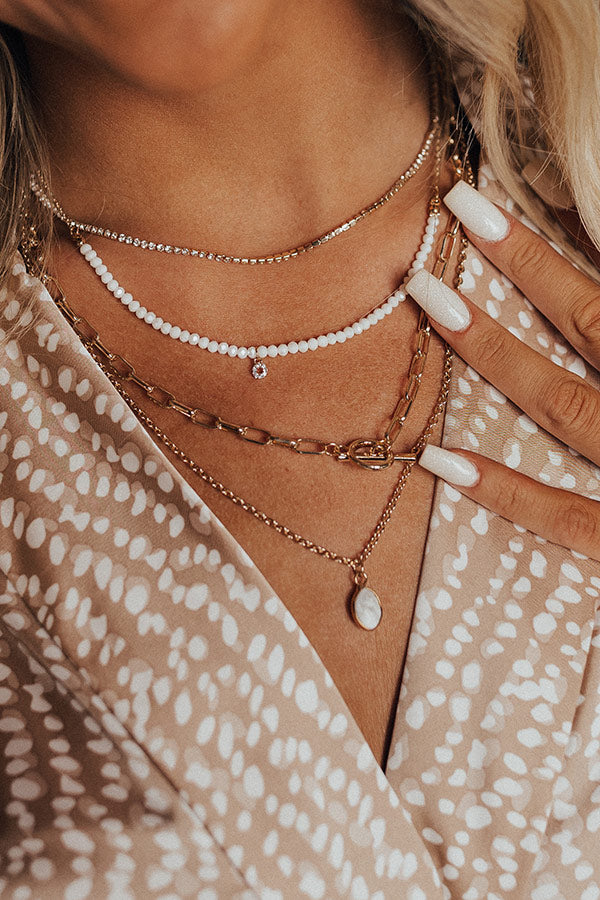 Add an upscale finish to any look with our luxe gold 'Vino On My Mind' necklace featuring four layered pieces: a tiny rhinestone choker, a medium length white beaded chain with a tiny seeing eye charm, a medium length larger link chain, and a longer dainty chain with a small white pendant!