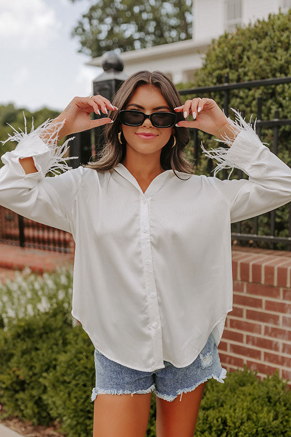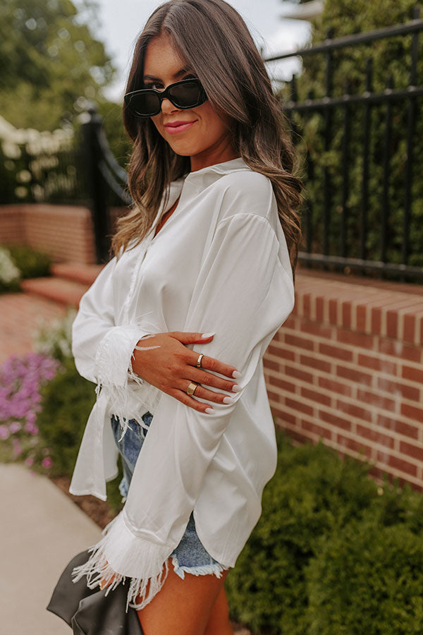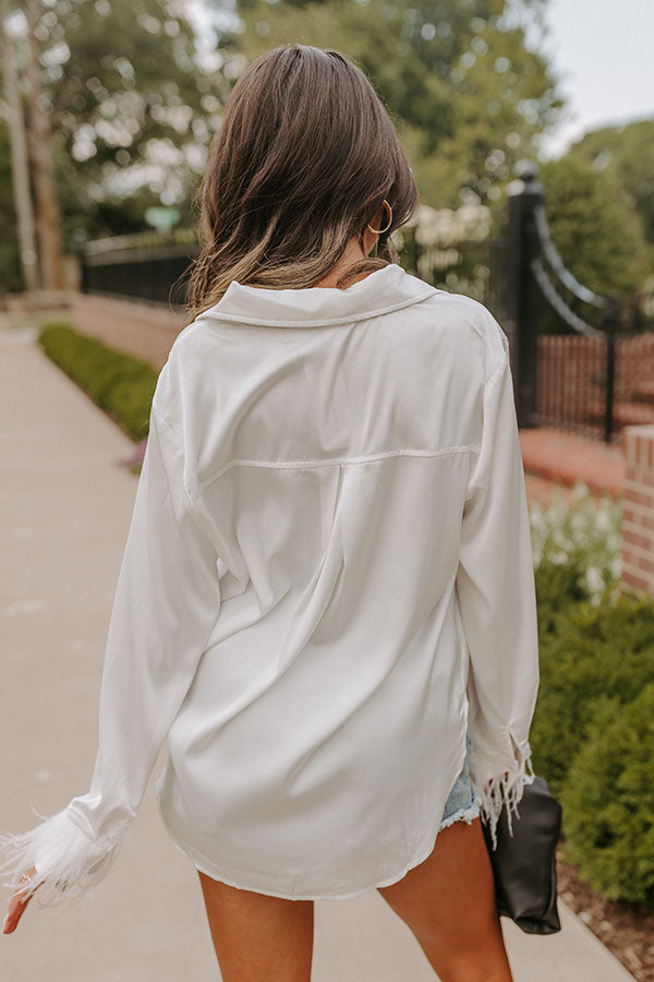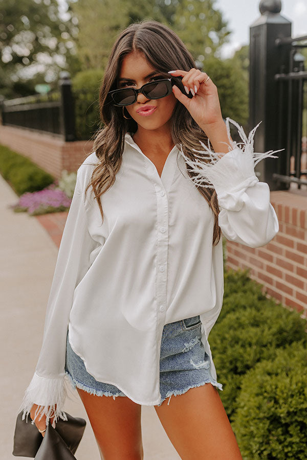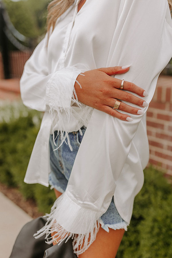 A flirty twist on a classic piece, our chic white 'Vino On My Mind' top featuring lightweight satin material, a button up front with a collared neckline, long loose sleeves with feather cuffs, and a slouched silhouette that falls into a rounded hemline!