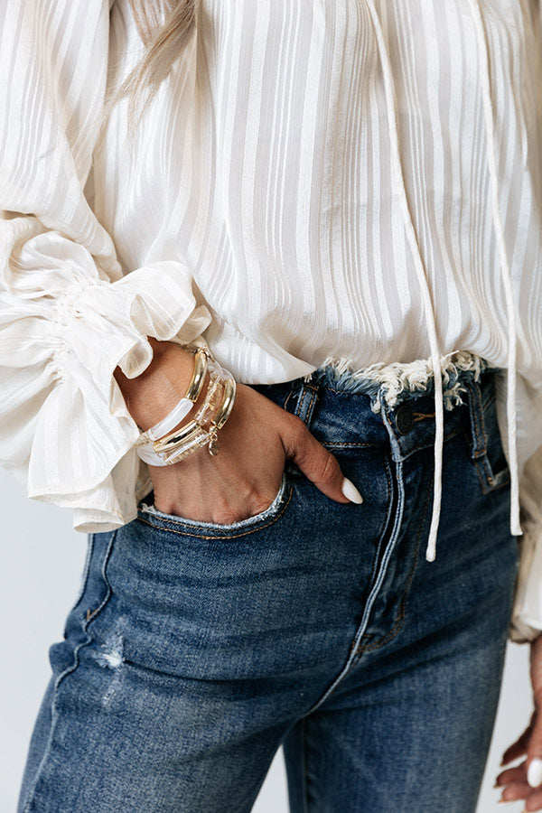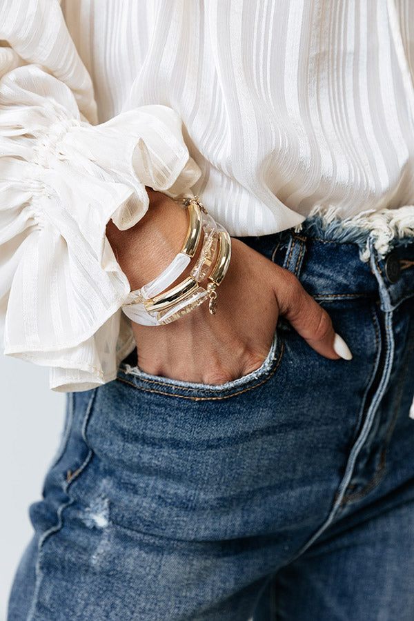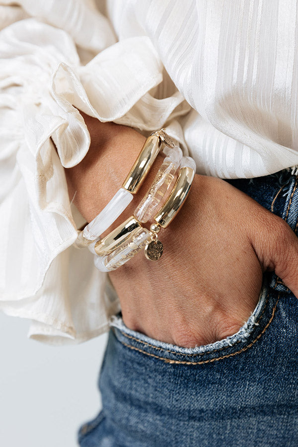 Complete your arm candy stack in luxury with our chic 'Vinyl Records Bracelet' featuring white, gold, and clear resin with gold speck stretch pieces!