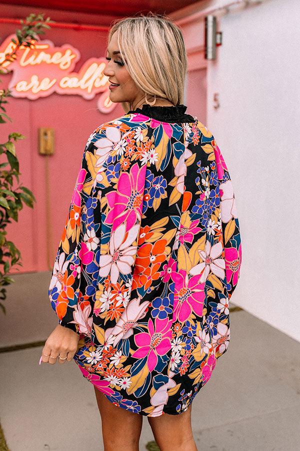 Layer up for those chilly summer nights by the waterside in our bold 'VIP Boarding Pass' overlay featuring lightweight material patterned with a beautiful purple, hot pink, light pink, yellow, green, and orange hued floral print, long loose sleeves, and a draped open front silhouette that falls into a rounded back hemline!