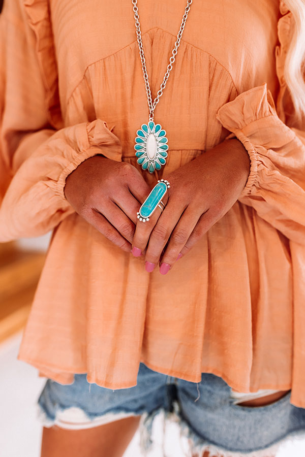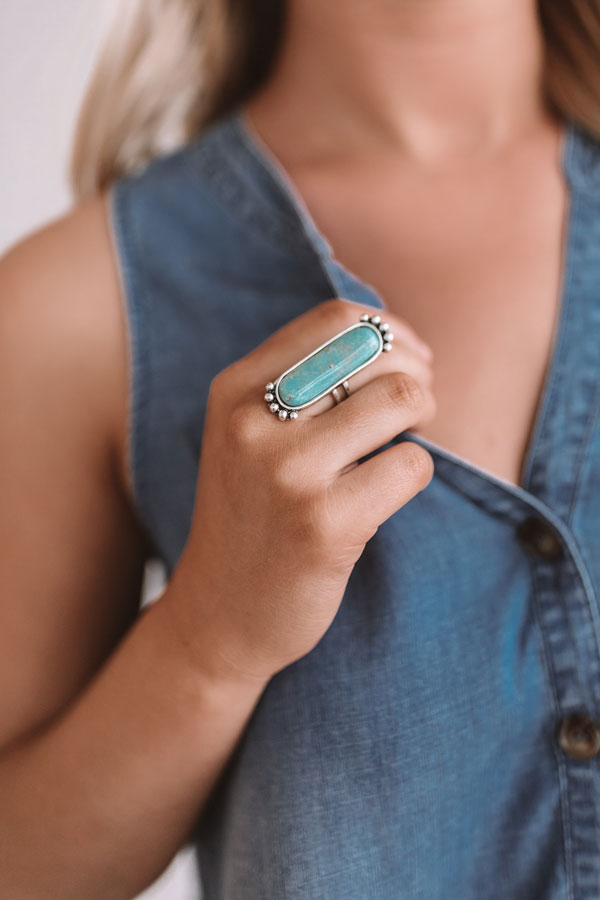 Event the smallest pieces of your look matter, so accessorize with our pretty 'VIP in Hawaii' ring featuring an elongated turquoise stone in a vintage silver setting with an adjustable band! As a natural stone, the colors may vary.