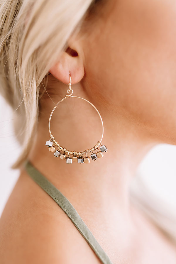 You will undoubtedly be on the VIP list when you wear these golden earrings featuring skinny hoops decorated with square gold and platinum charms!