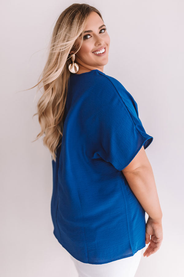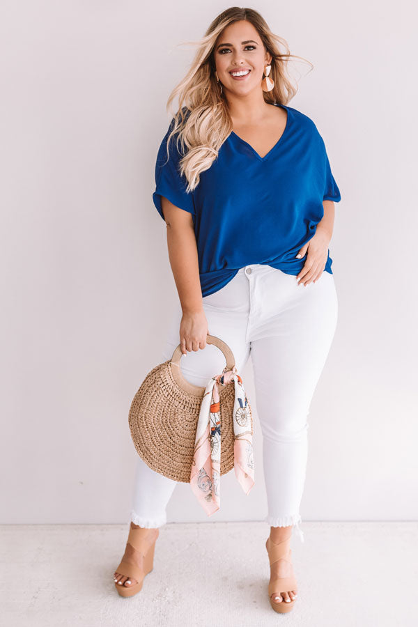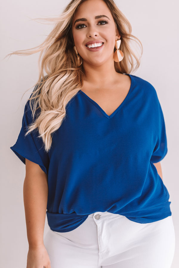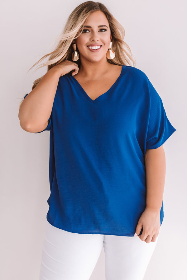 Plus Size - This basic v-neck shirt is for all you impressionable ladies out there that have been shopping your whole life but still have nothing to wear! Simply style this royal blue piece with some casual pants and a neutral wedge for a classic everyday summer look! Measurements
