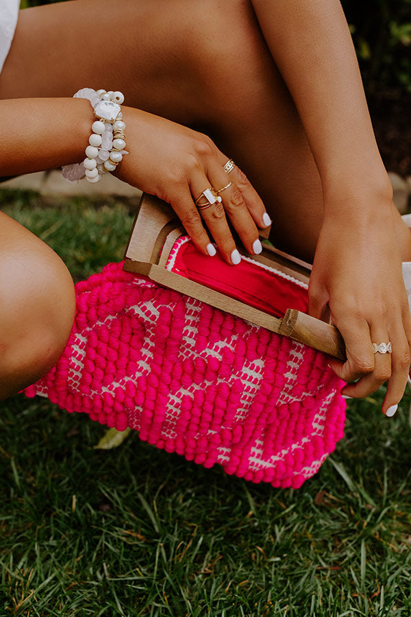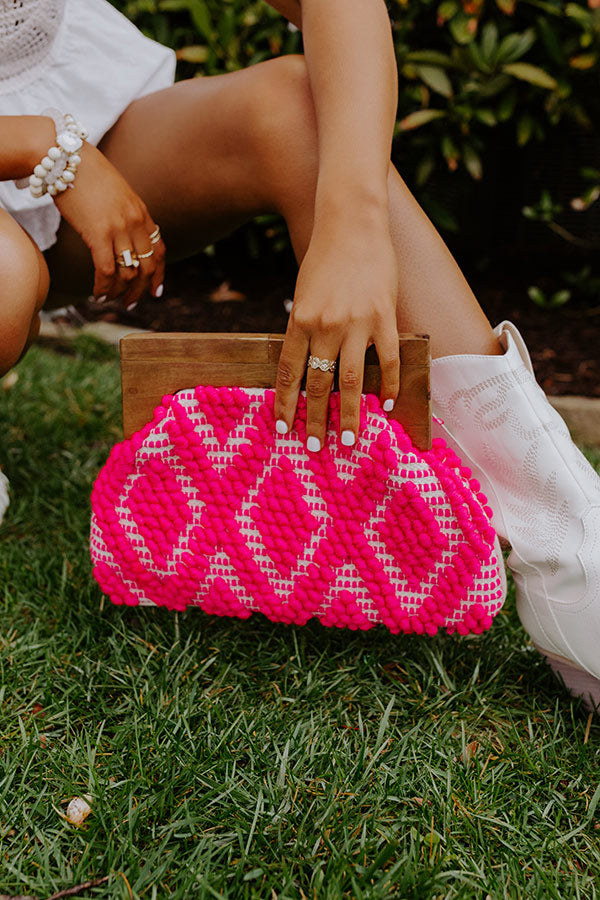 The perfect transitional accessory, our seasonal 'Vitamin Sea For Me' clutch featuring thick hot pink woven material, a wooden pressure closure, and a spacious fully lined pouch silhouette!