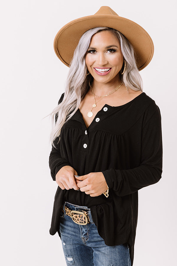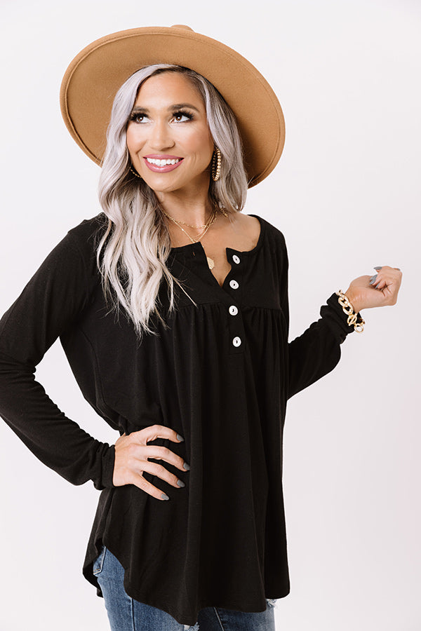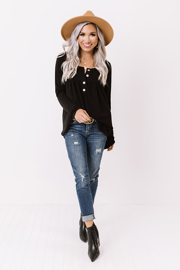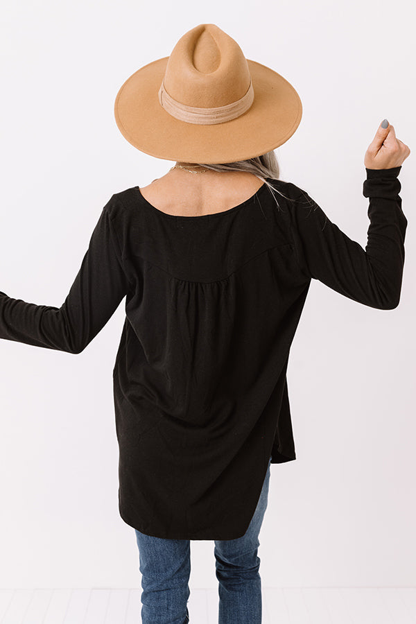 Embrace the fall season in our charming black "Vivid Autumn Shift Top" featuring lightweight flowy material, a button up bodice with a scooped neckline, long form fitting sleeves, and a draped silhouette that falls into a rounded tunic-length hemline! Measurements