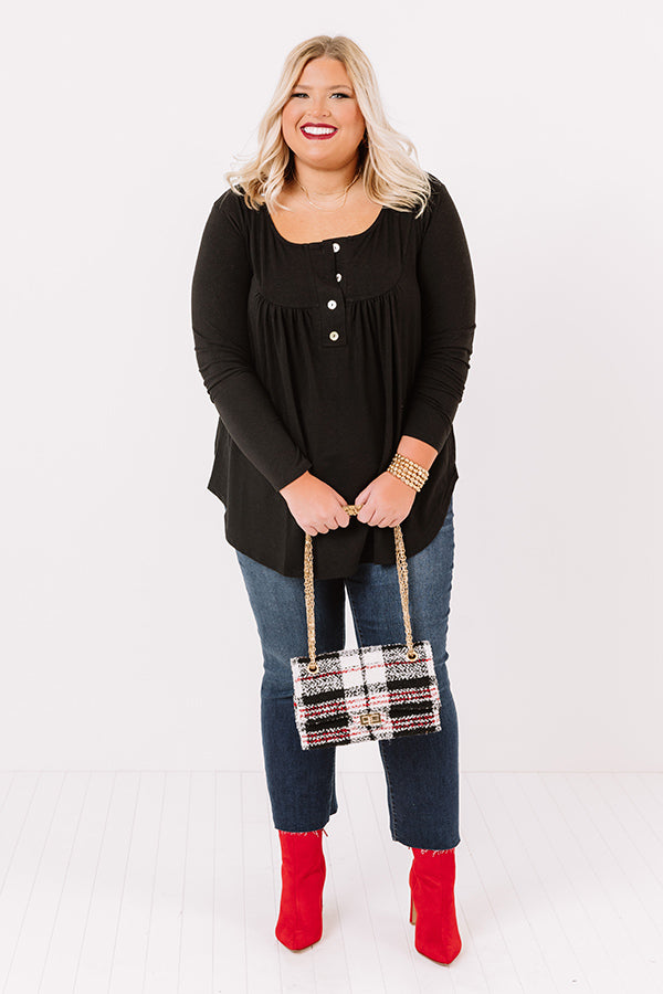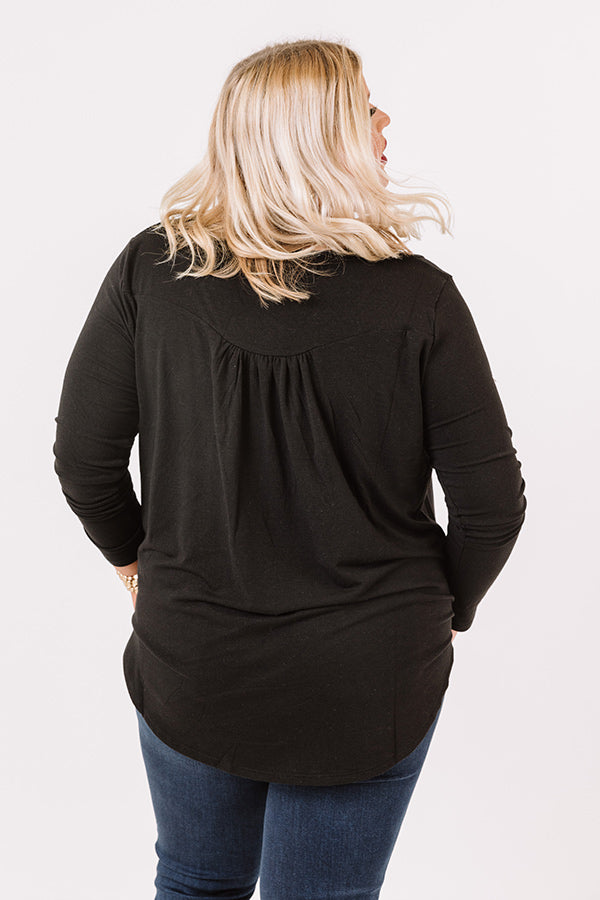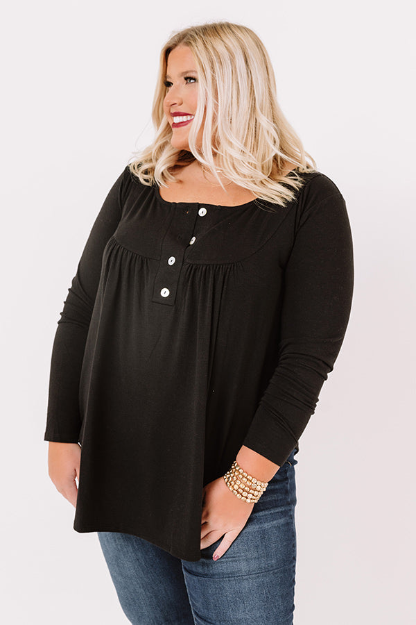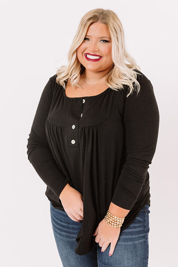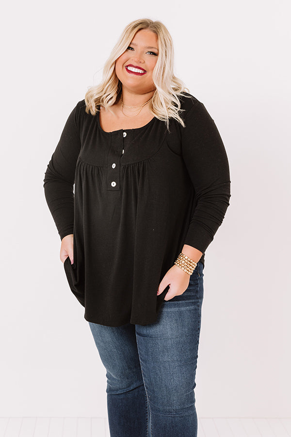 Plus Size - Embrace the fall season in our charming black "Vivid Autumn Shift Top" featuring lightweight flowy material, a button up bodice with a scooped neckline, long form fitting sleeves, and a draped silhouette that falls into a rounded tunic-length hemline! Measurements