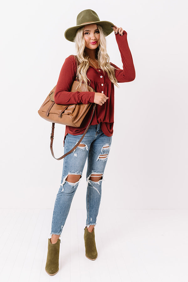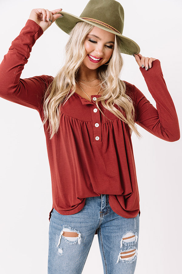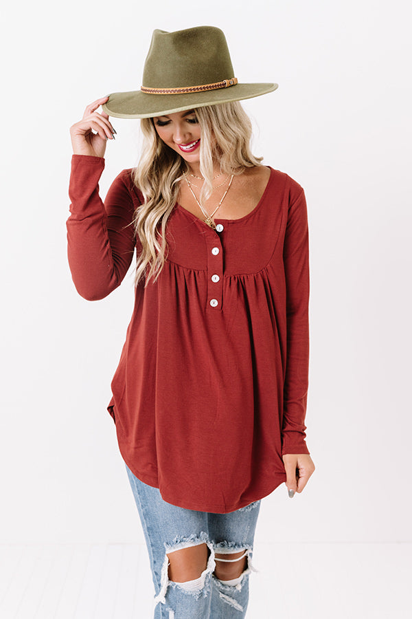 Embrace the fall season in our charming dark rust colored "Vivid Autumn Shift Top" featuring lightweight flowy material, a button up bodice with a scooped neckline, long form fitting sleeves, and a draped silhouette that falls into a rounded tunic-length hemline! Measurements