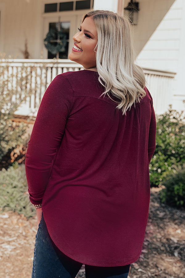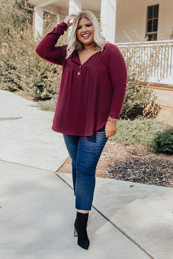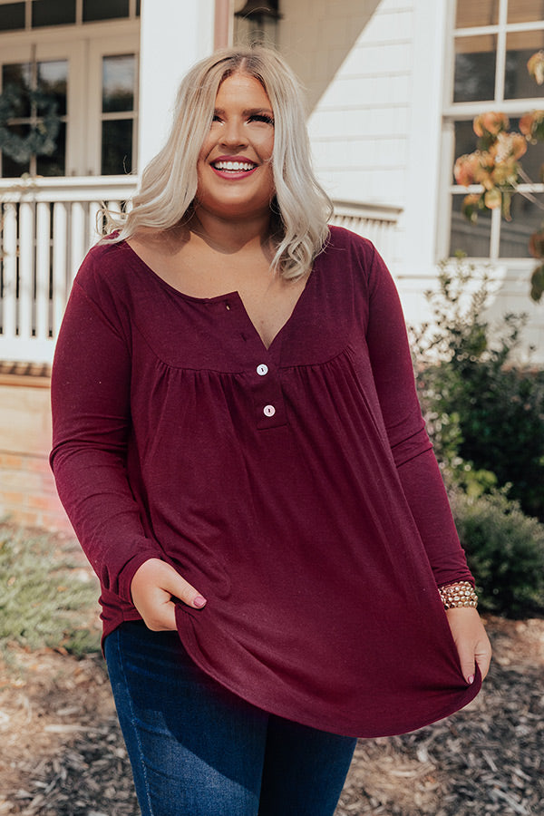 Plus Size - Embrace the fall season in our charming merlot colored "Vivid Autumn Shift Top" featuring lightweight flowy material, a button up bodice with a scooped neckline, long form fitting sleeves, and a draped silhouette that falls into a rounded tunic-length hemline! Measurements