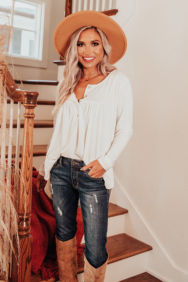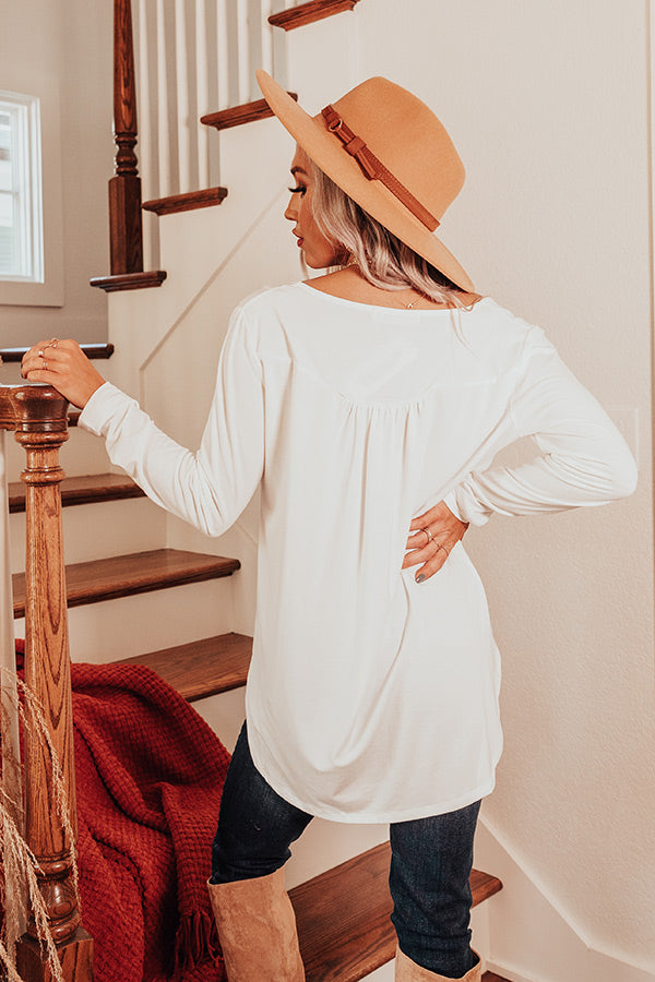 Embrace the fall season in our charming white "Vivid Autumn Shift Top" featuring lightweight flowy material, a button up bodice with a scooped neckline, long form fitting sleeves, and a draped silhouette that falls into a rounded tunic-length hemline! Measurements