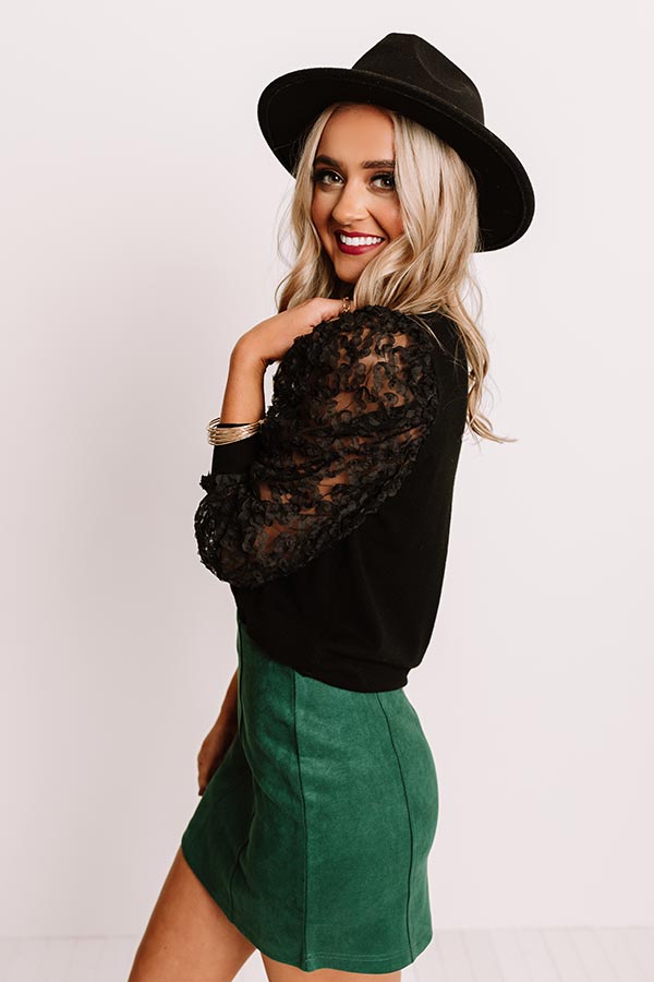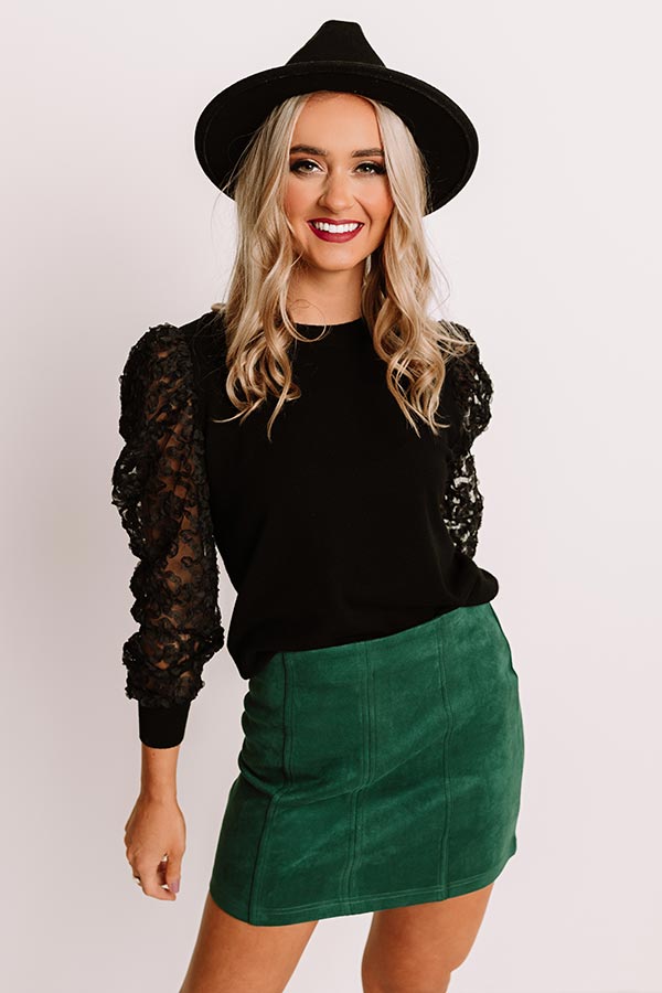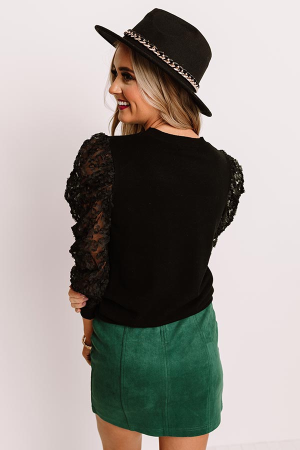 This luxe black top is worthy of being on the cover of Vogue with its lightweight bodice, high rounded neckline, long loose semi-sheer sleeves with puff shoulder, fitted cuffs, and unique texturing, and a flattering silhouette that ends in a straight hemline! Measurements