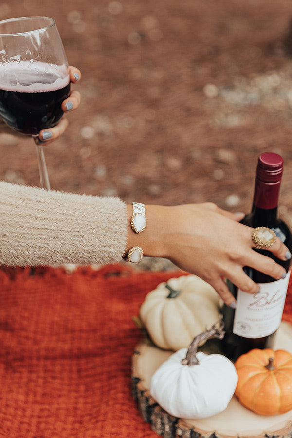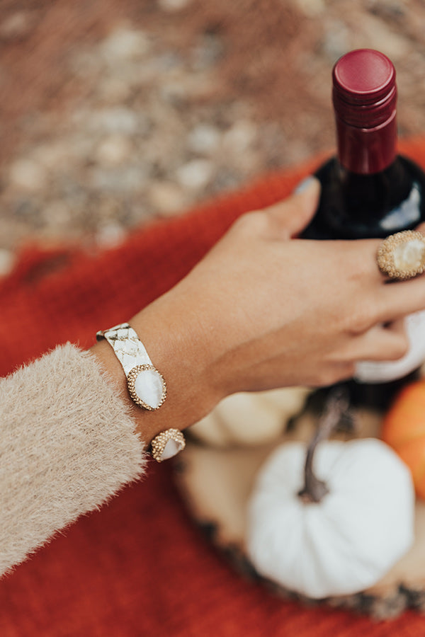 You've been waiting for a lifetime for a bracelet this gorgeous with its adjustable snake print band bookend by two white druzy accent stones surrounded in shimmering rhinestones!