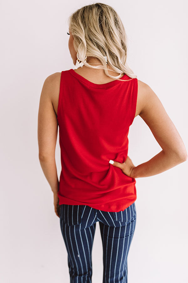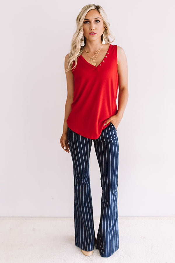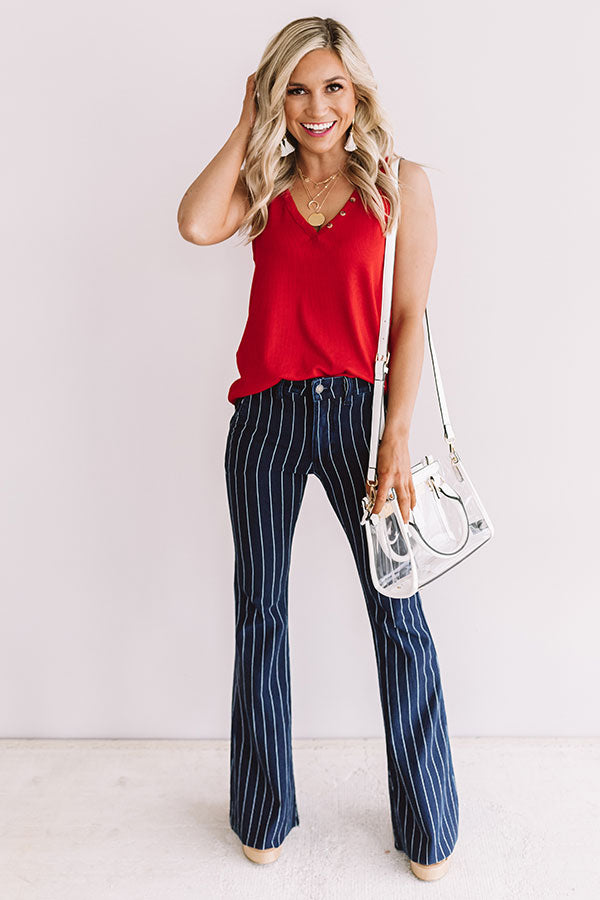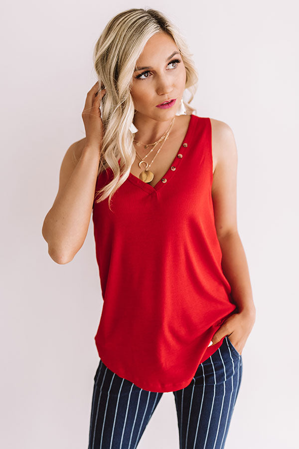 When it is warm enough to wear this red shift tank you will no longer be "waiting for the sun!" Summer will be here and this pieces ribbed fabric and button up v-neck makes it perfect for pairing with pin striped navy flares, wedges, and a transparent crossbody for the perfect gameday outfit or with our "Clara High Waist Distressed Work" and "The Byrdie Wedge in Red" for a more simple everyday look! Measurements
