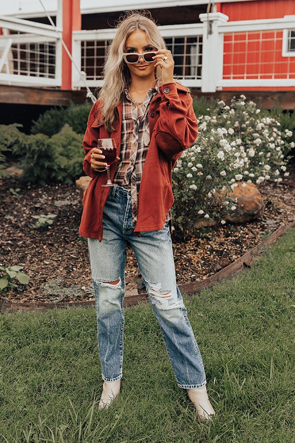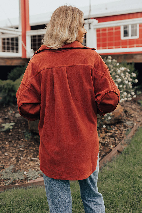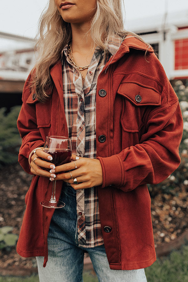 Sure to be your new fave fall piece, our versatile dark rust colored 'Wake Up Call Jacket' features warm material, a button down front with a collared neckline, long loose sleeves with button closure cuffs, two accent chest pockets with flap closures and two side pockets, and a relaxed silhouette that falls into a rounded hemline!