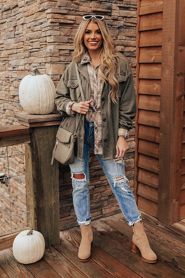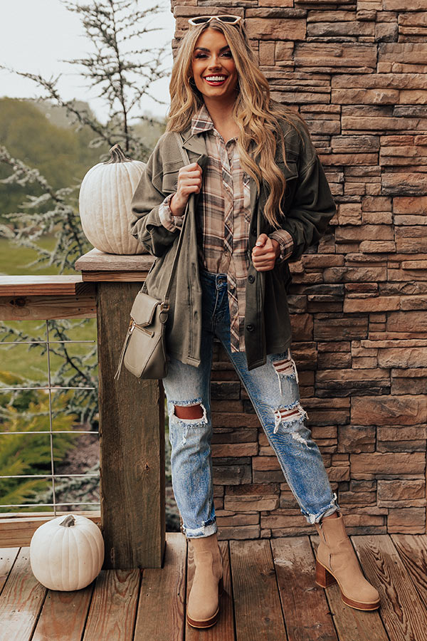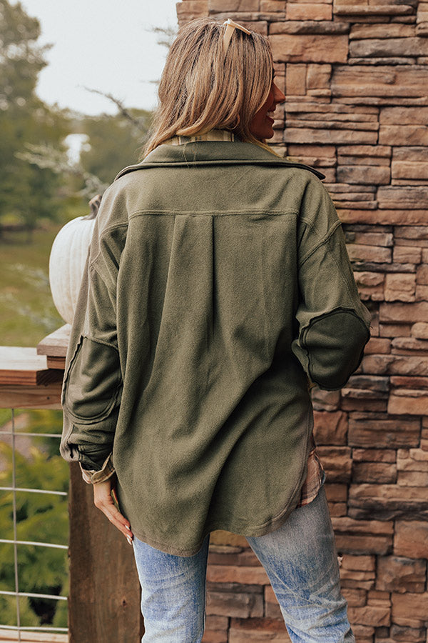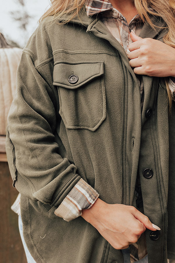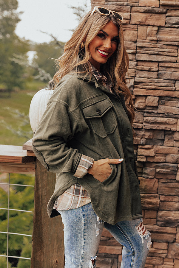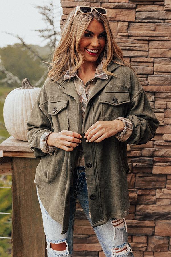Sure to be your new fave fall piece, our versatile olive colored 'Wake Up Call Jacket' features warm material, a button down front with a collared neckline, long loose sleeves with button closure cuffs, two accent chest pockets with flap closures and two side pockets, and a relaxed silhouette that falls into a rounded hemline!