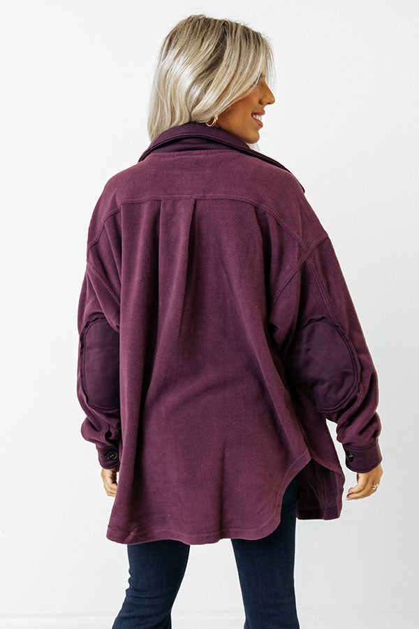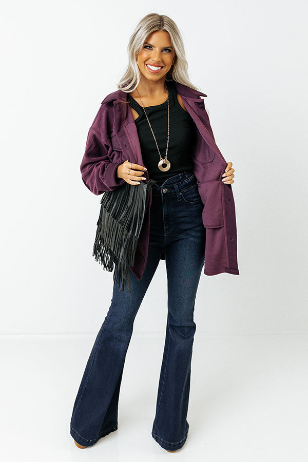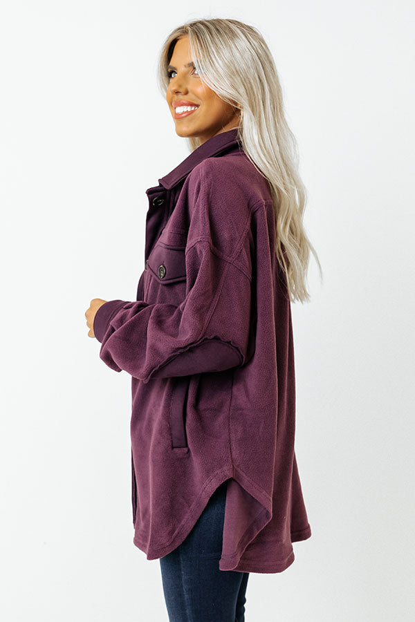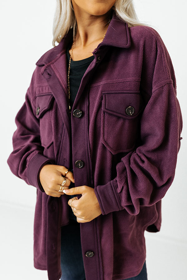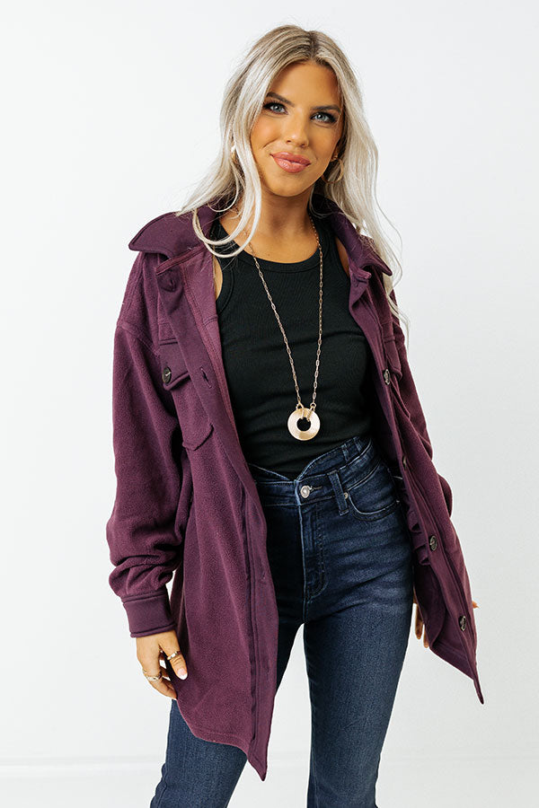 Sure to be your new fave fall piece, our versatile purple 'Wake Up Call Jacket' features warm material, a button down front with a collared neckline, long loose sleeves with button closure cuffs, two accent chest pockets with flap closures and two side pockets, and a relaxed silhouette that falls into a rounded hemline!