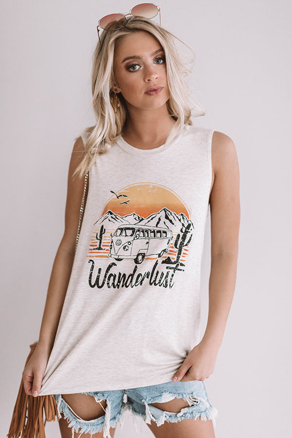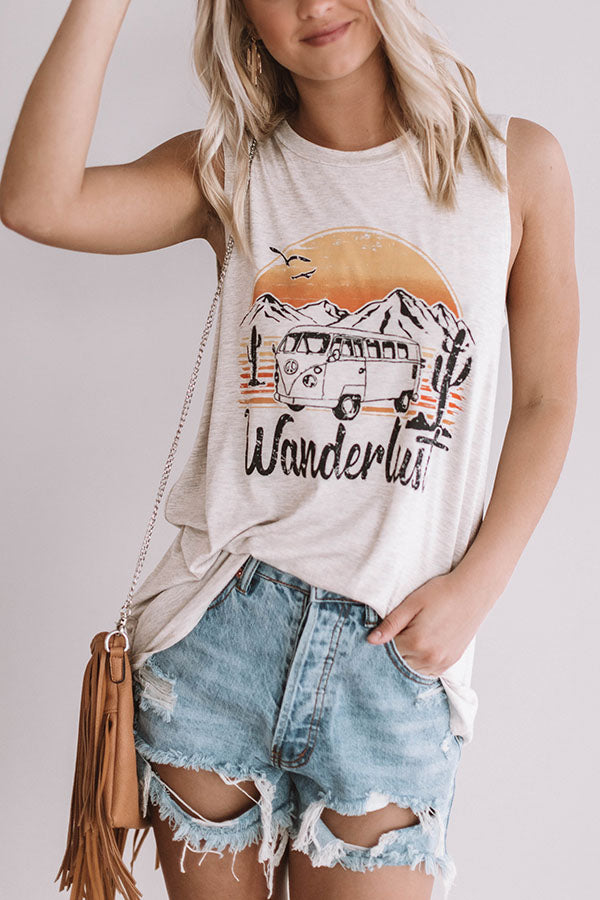 Life is a party, so dress like it in this graphic "Wanderlust" grunge shift tank that has wide straps and features a stylish dessert scene on the front! Pair this with some distressed denim and some modern sneakers for a perfect summer festival outfit! Measurements