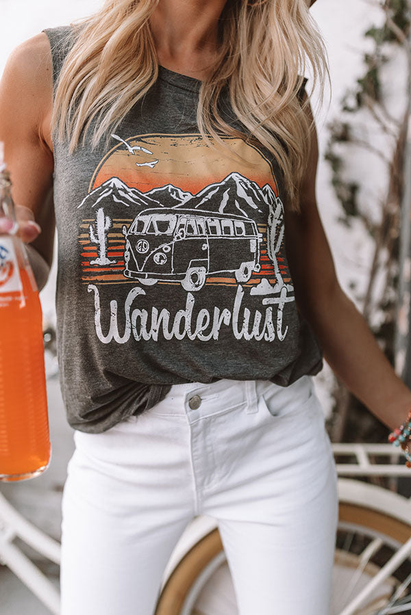 Life is a party, so dress like it in this graphic dark grey "Wanderlust" grunge shift tank featuring soft lightweight material, wide shoulders straps, a stylish dessert scene on the front, a rounded neckline, and a relaxed silhouette that falls into a straight hemline! Style this adorable piece with some distressed denim or white flares and some modern sneakers or wedges for a a variety of perfect summer festival outfits! Measurements