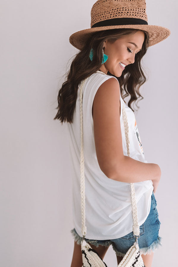 Life is a party, so dress like it in this graphic "Wanderlust" grunge shift tank that has wide straps and features a stylish dessert scene on the front! Pair this with some distressed denim and some modern sneakers for a perfect summer festival outfit! Measurements