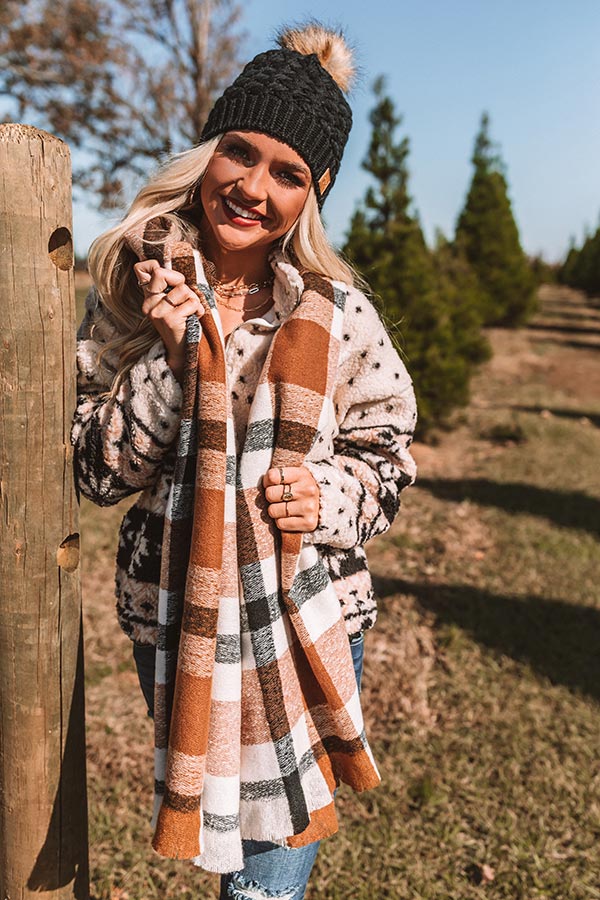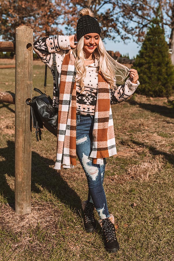 You are sure to stay warm and snuggly when you cozy up with this adorable scarf featuring soft lightweight material patterned with a large black, white, and orange hued plaid print!