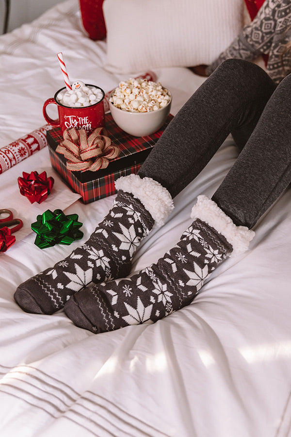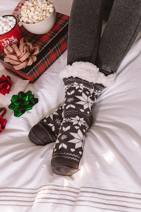 Get all warm and snuggly with these adorable grey socks featuring ultra soft sherpa lining and a cute winter pattern!