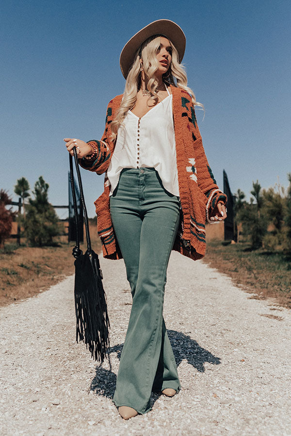 You are sure to have some "warm fuzzy feels" when you wear this rust colored cardigan featuring thick loose knit material with cream and green hued aztec patterns, long oversized bishop sleeves with fitted cuffs, ribbed trim detailing, two accent pockets, and an ultra relaxed open front silhouette that falls into a straight tunic length hemline! You can style this versatile piece with just about anything from a basic tank to a sweater, jeans to skirts or dresses, booties to wedges or sandals, clutches to totes, and hats to earrings! Measurements