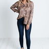 You are sure to emit a warm glow when you arrive in this beautiful top featuring lightweight material patterned with a purple, camel, and brown hued spotted print, a button up front with a collared neckline, long loose sleeves with button closures, two accent chest pockets with flap closures, and a relaxed silhouette that fall into a straight hemline!